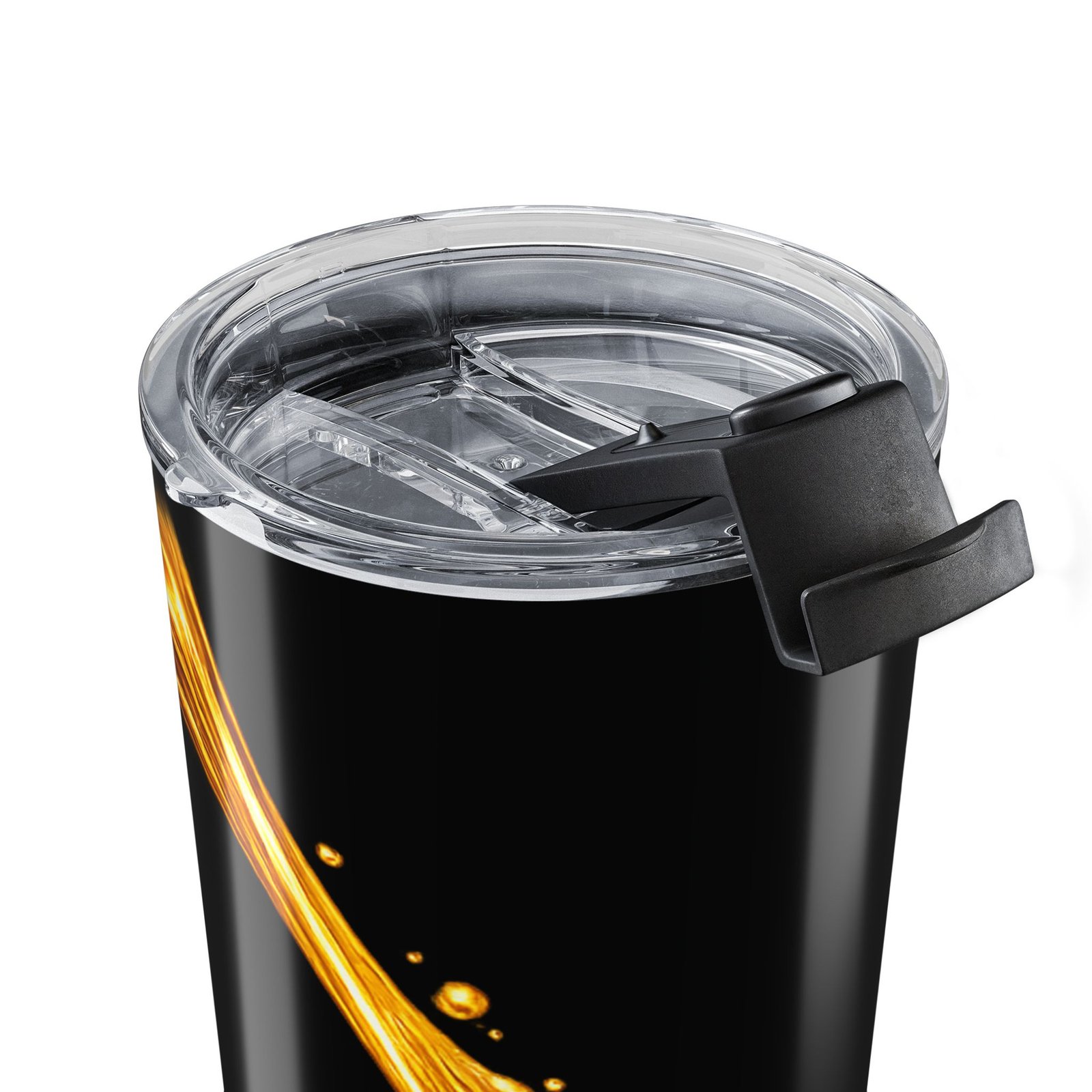 Constructed from vacuum-insulated stainless steel, the tumbler keeps drinks hot or cold while turning a simple travel cup into a visible brand surface.