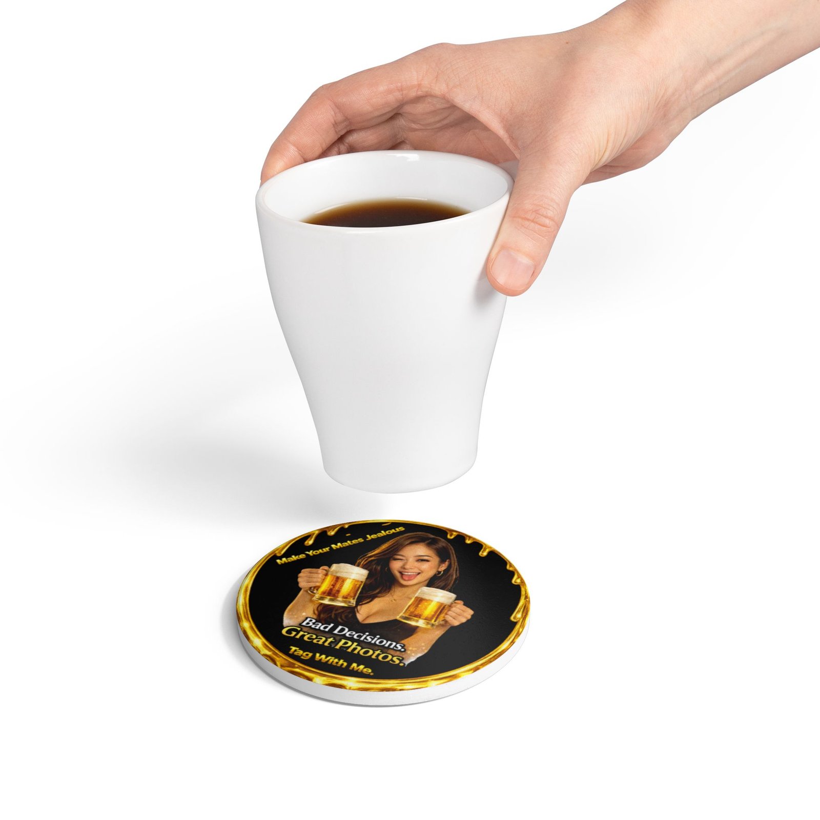 The Bad Decisions. Great Photos. Kiss Snap Tag ceramic coaster brings party energy directly to the table.