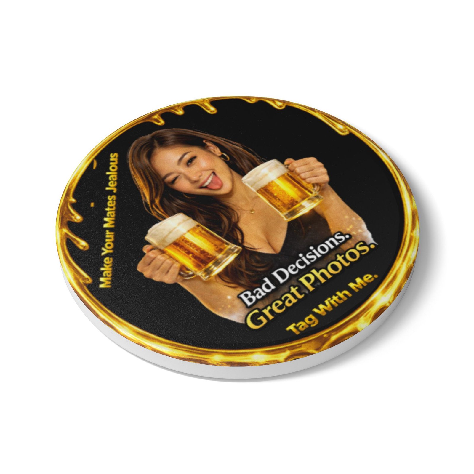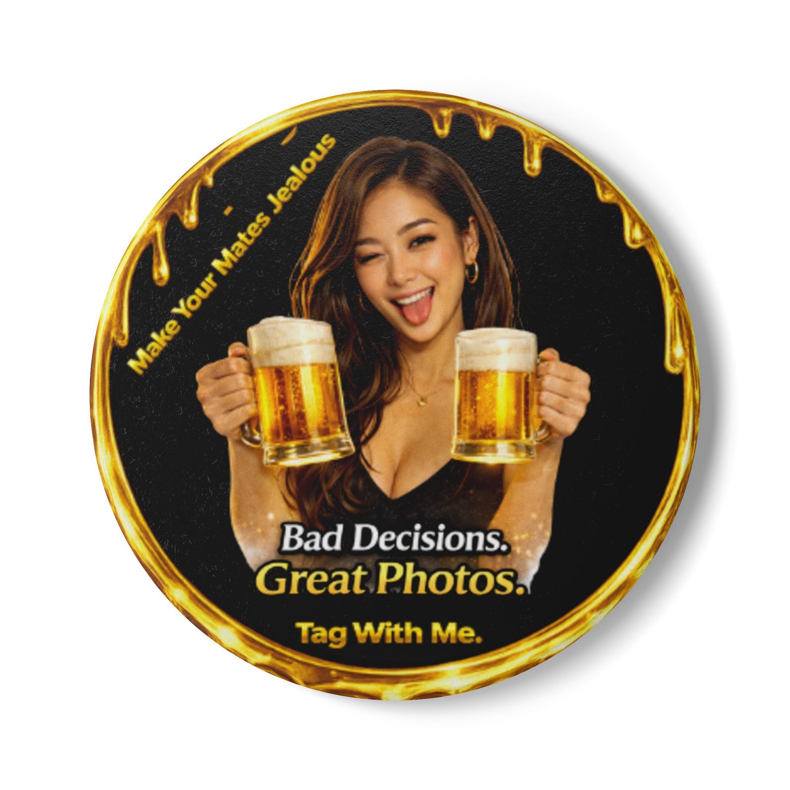 Surrounded by the signature liquid gold drip border, the design features a playful beer toast moment paired with the bold phrase Bad Decisions. Great Photos. — a perfect trigger for laughs, selfies, and shareable moments.