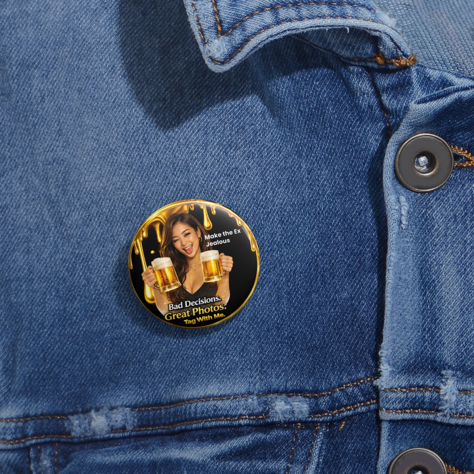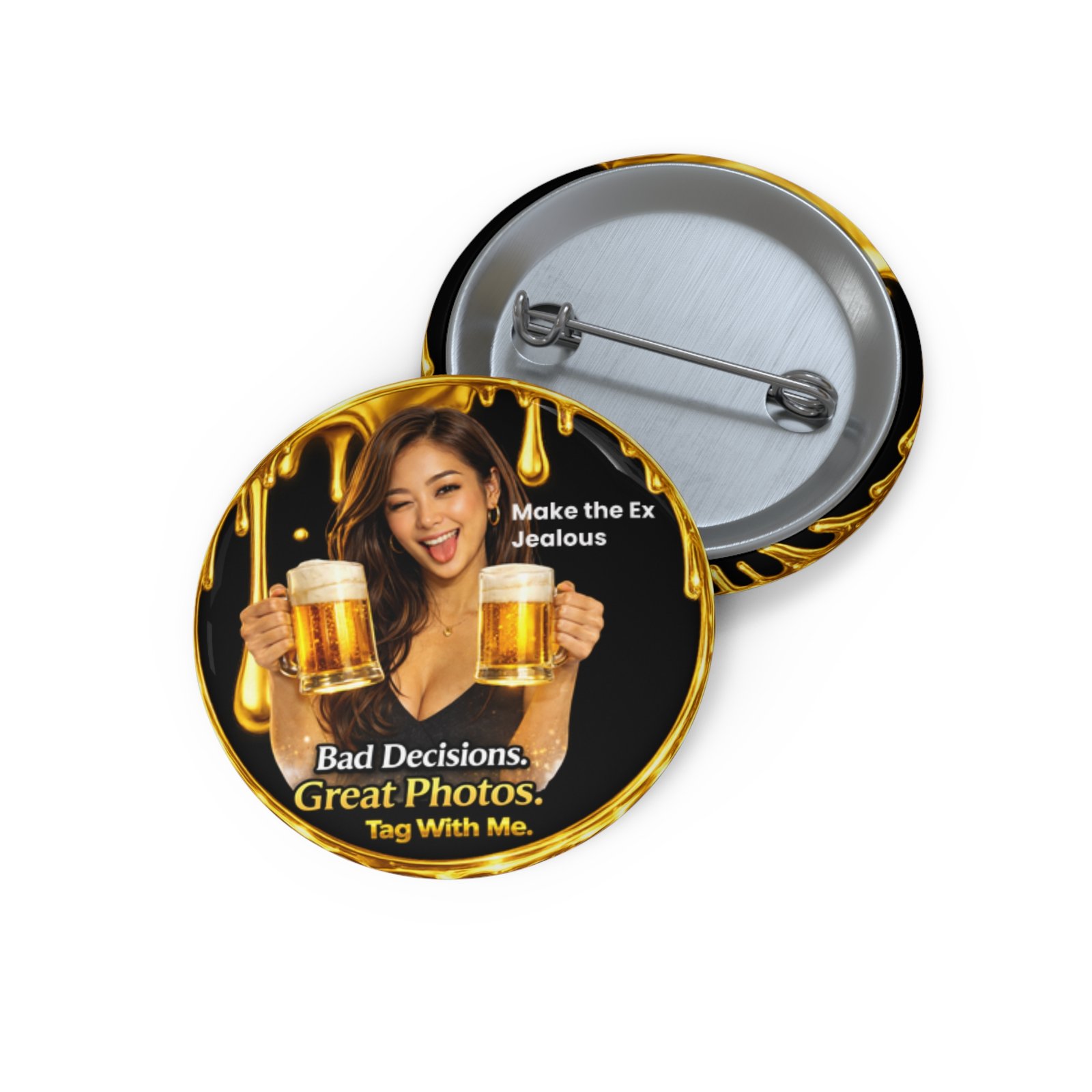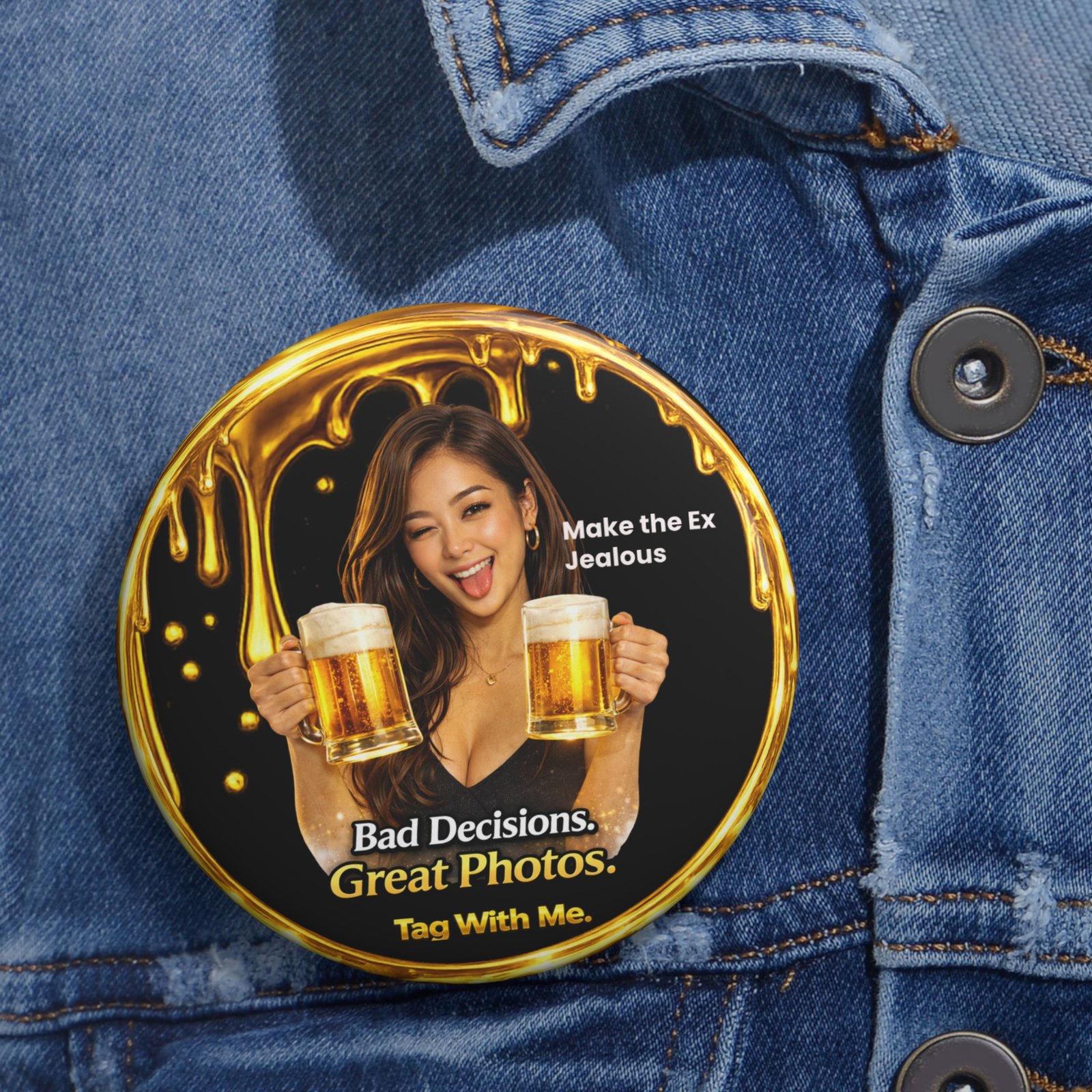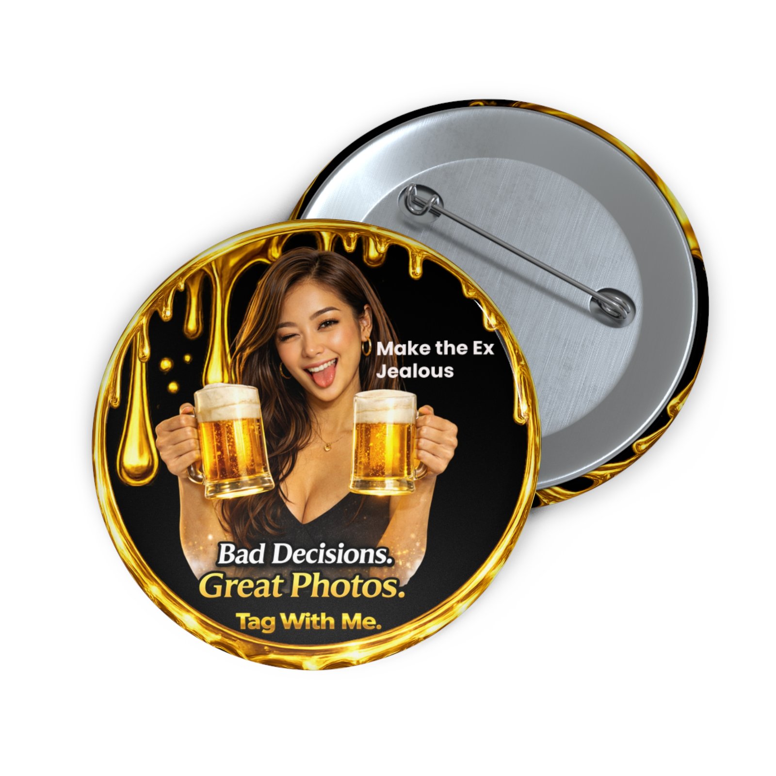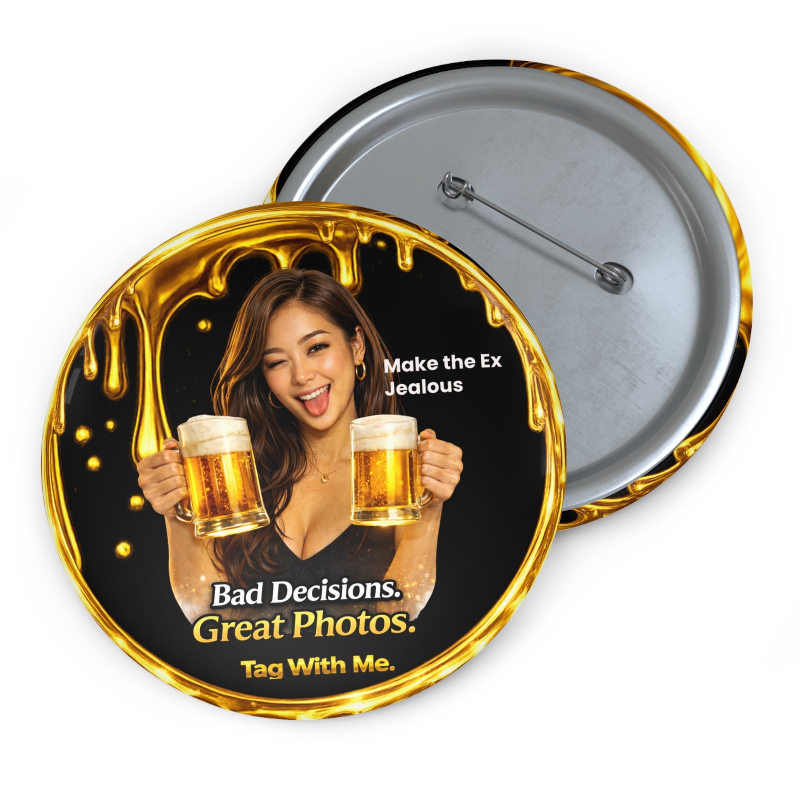 Featuring the mischievous portrait holding two beer mugs with a cheeky expression, the design blends a glossy black background, glowing gold sparkles, and a dripping metallic gold frame that surrounds the badge. The bold Bad Decisions. Great Photos. slogan captures the fun chaos of unforgettable nights, while the playful “Make the Ex Jealous” detail adds a cheeky edge.