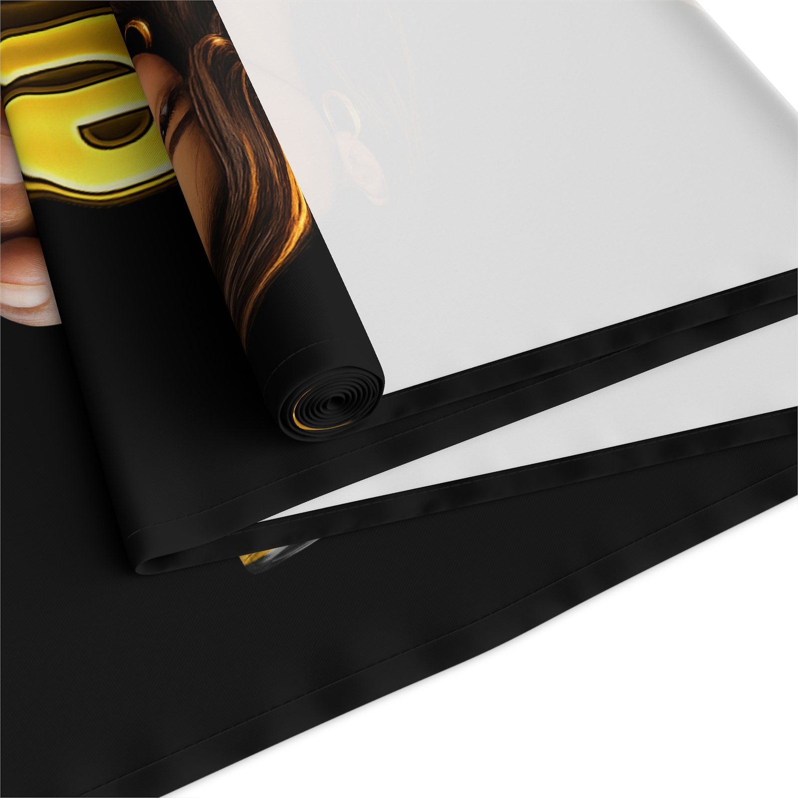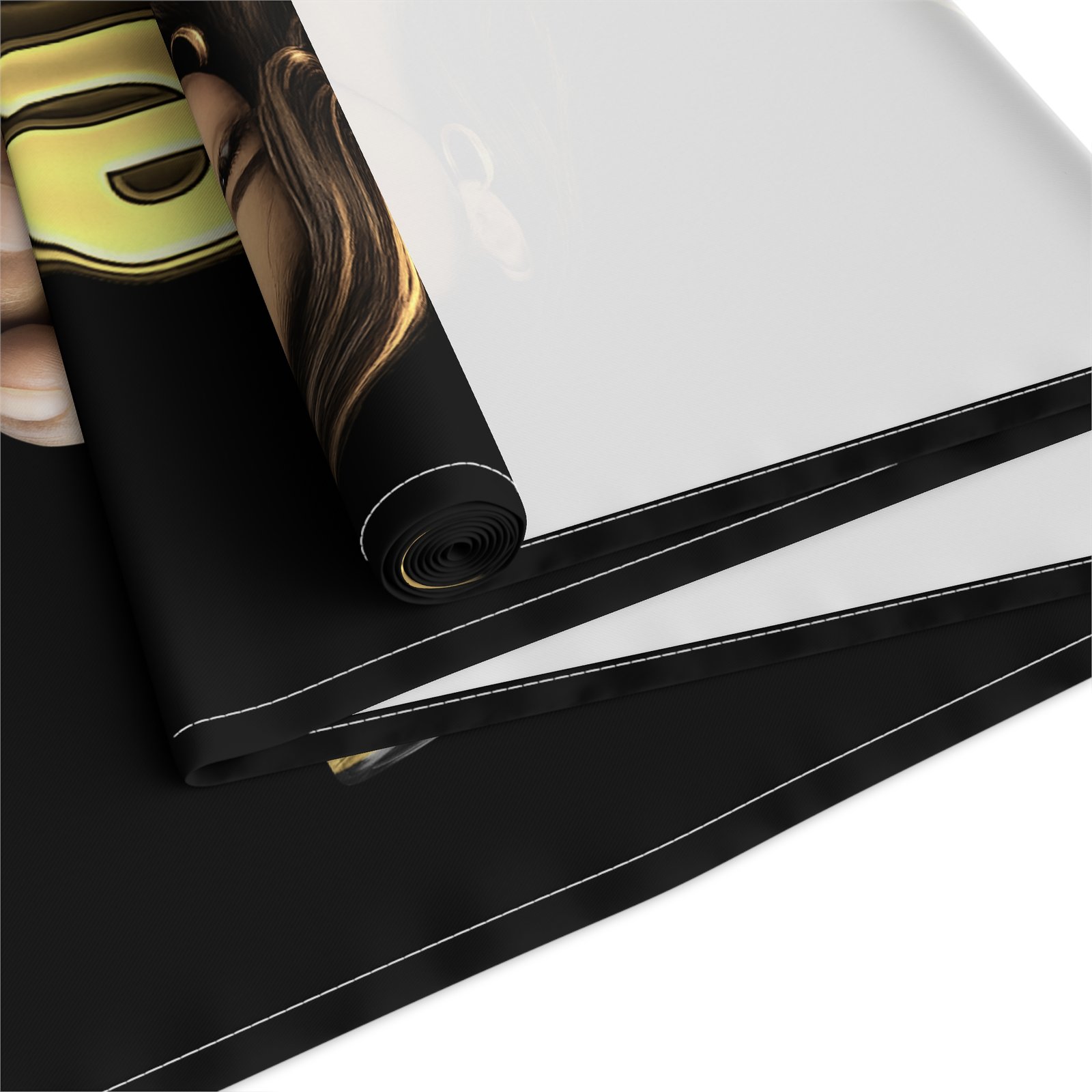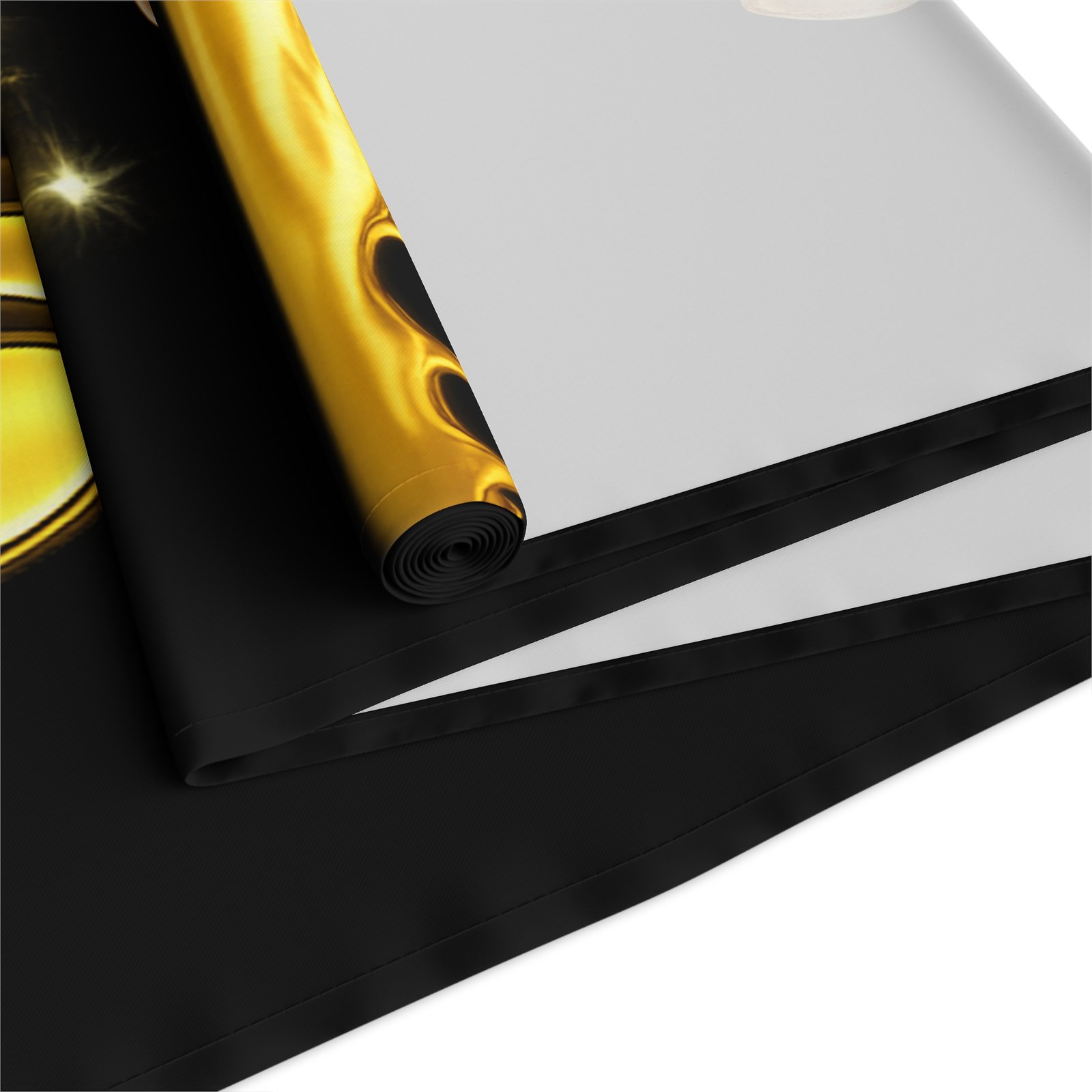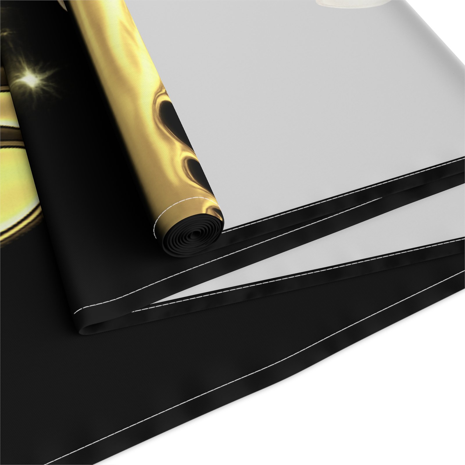 Built on a deep black lounge-style background, the runner features striking liquid gold drip artwork, bold Cheers typography, and a celebratory beer visual that captures the feeling of raising a glass with friends.