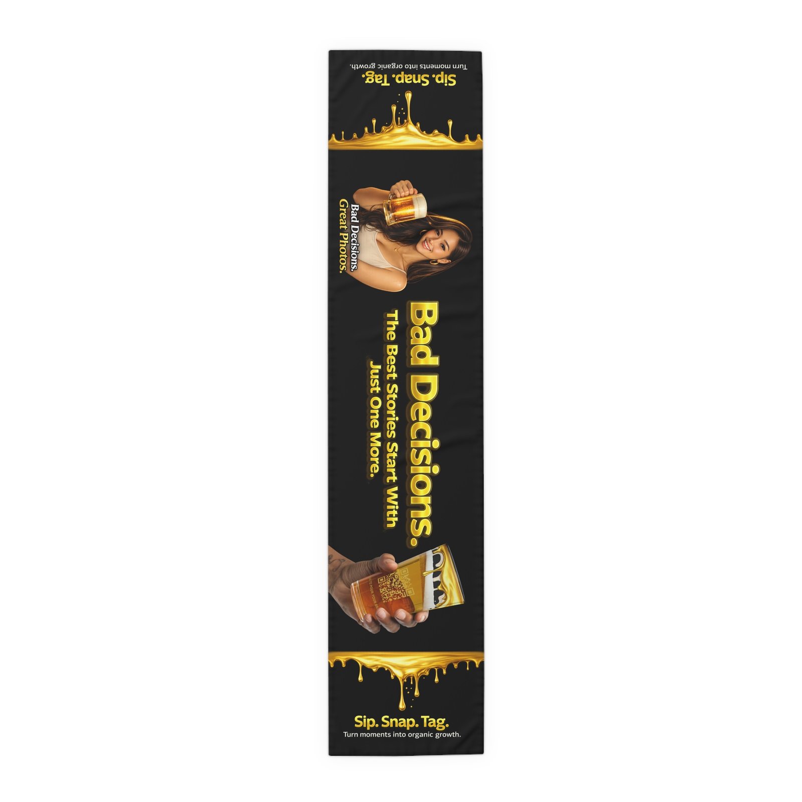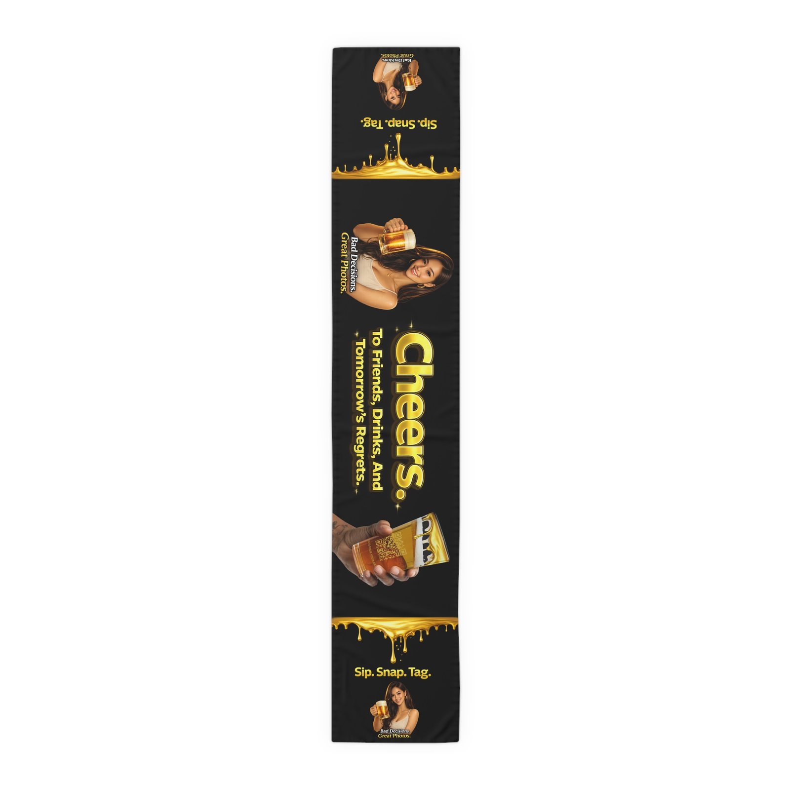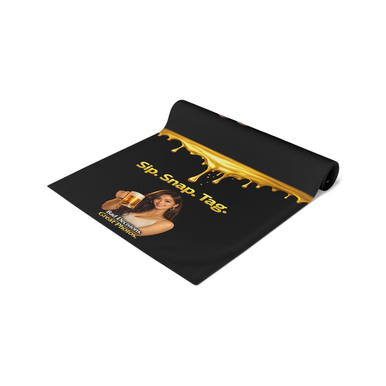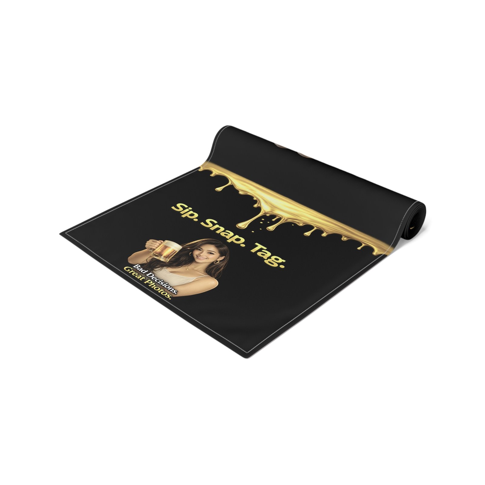 The runner blends playful bar culture with strong visual impact. A raised beer glass graphic sits within the design while the Sip. Snap. Tag. message appears at the ends, encouraging guests to capture the moment and share it.