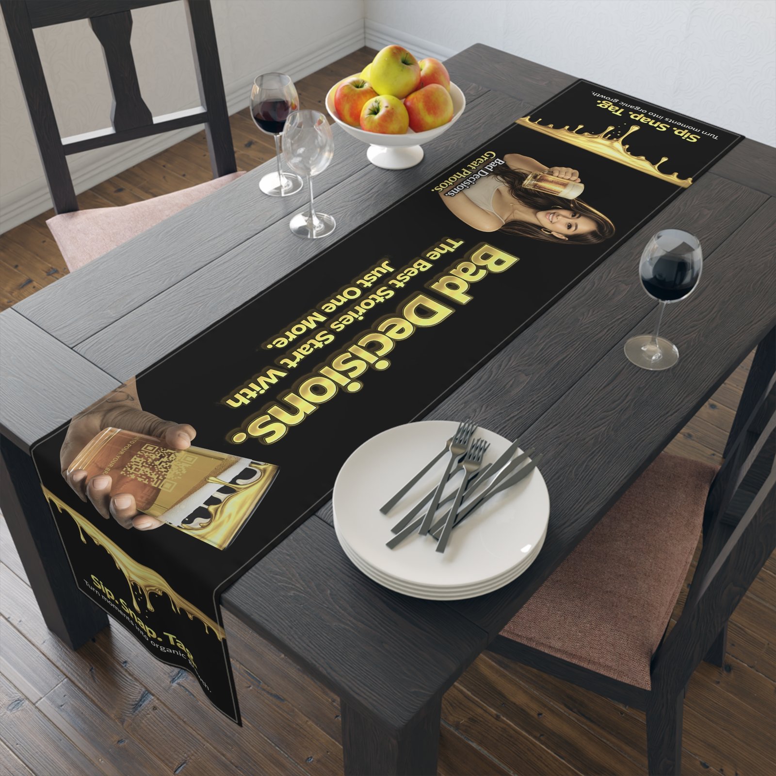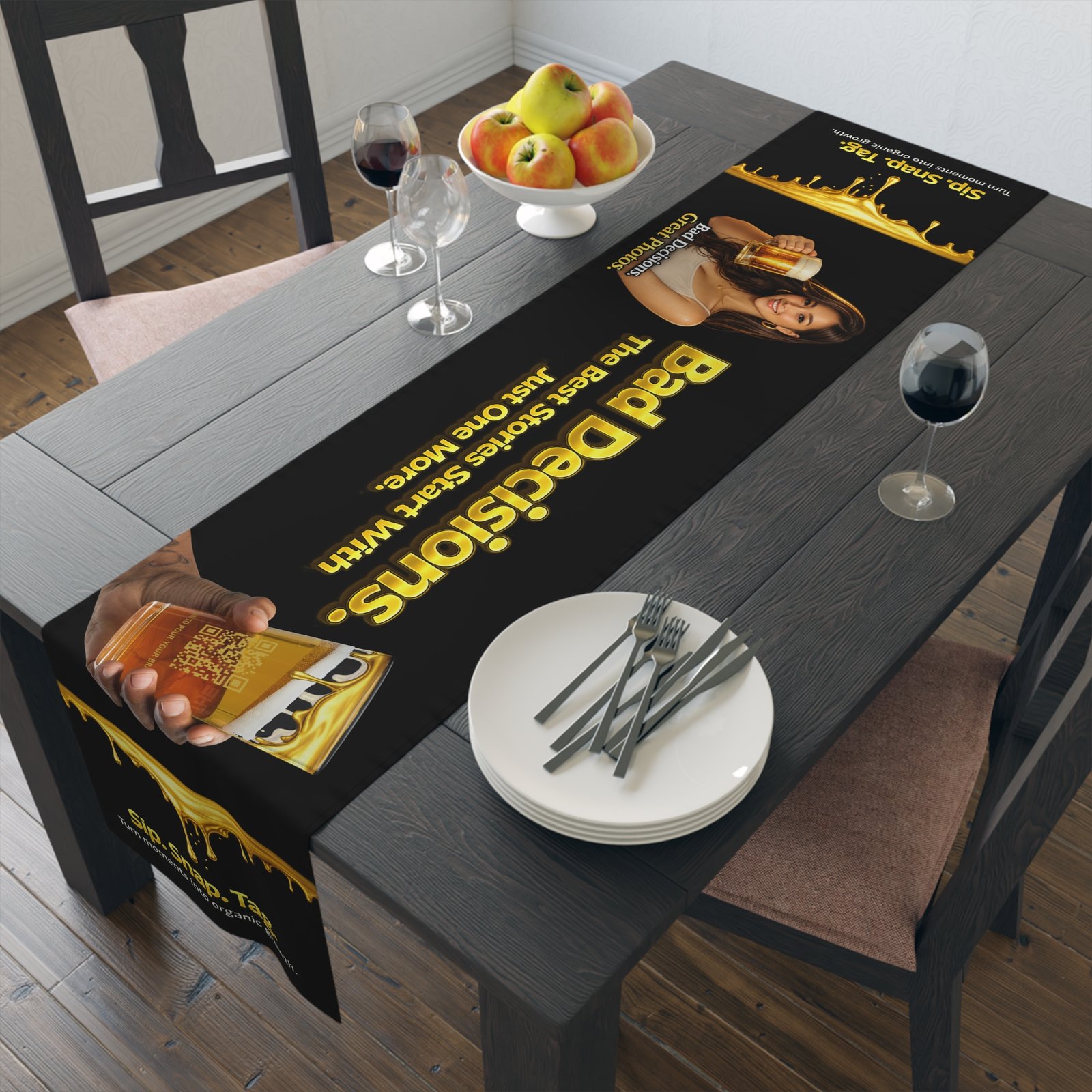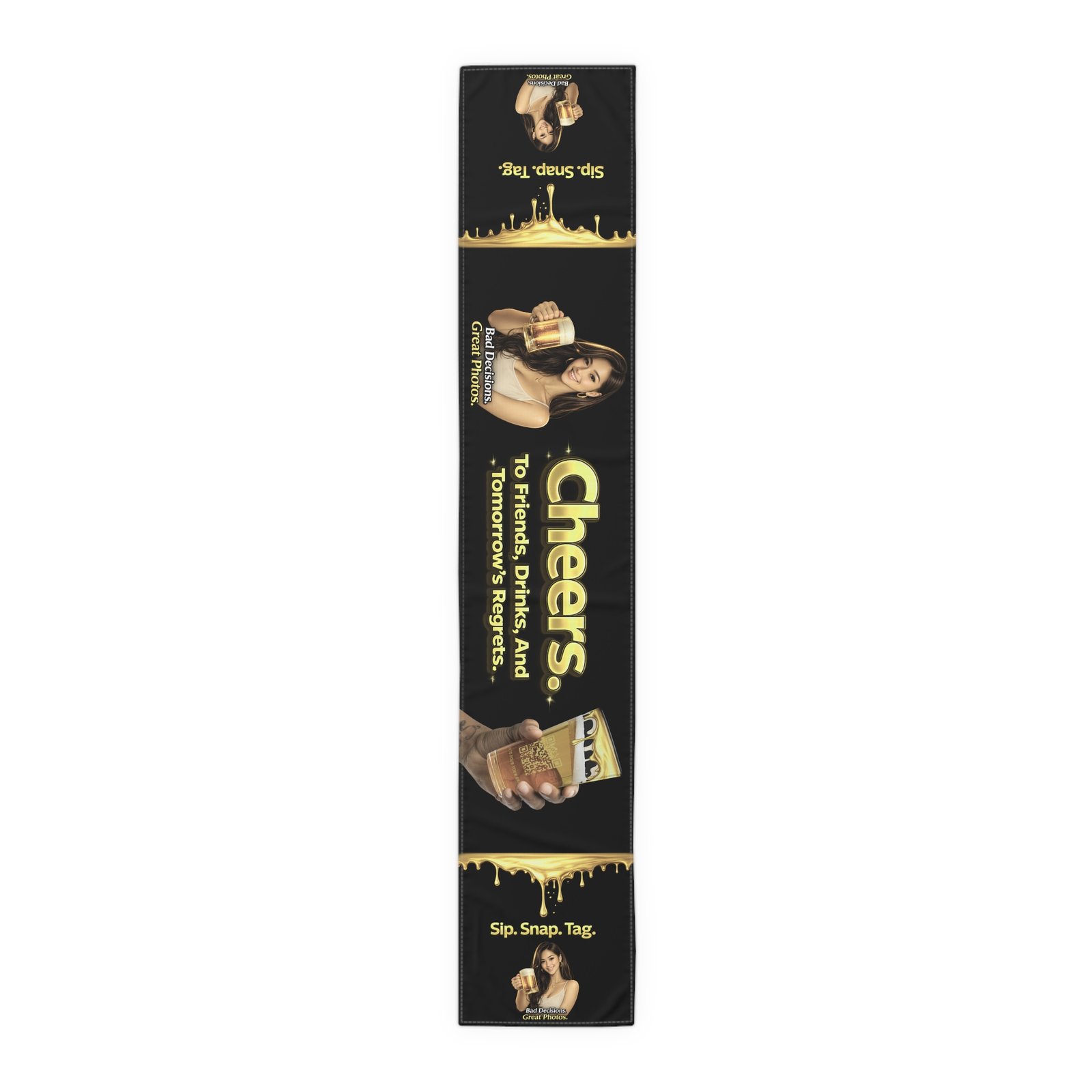 The Cheers — To Friends, Drinks, And Tomorrow’s Regrets table runner delivers bold nightlife personality straight down the centre of the table.