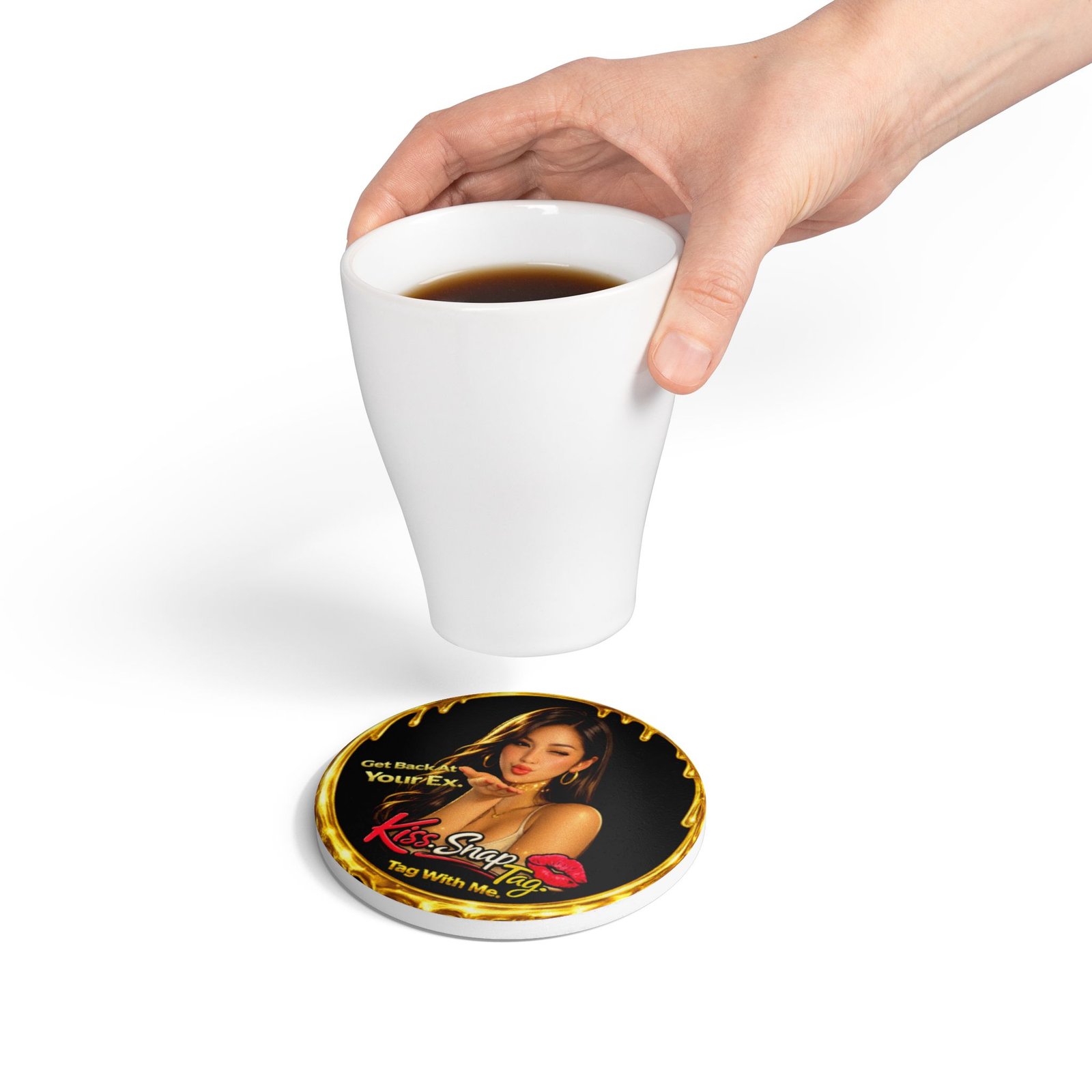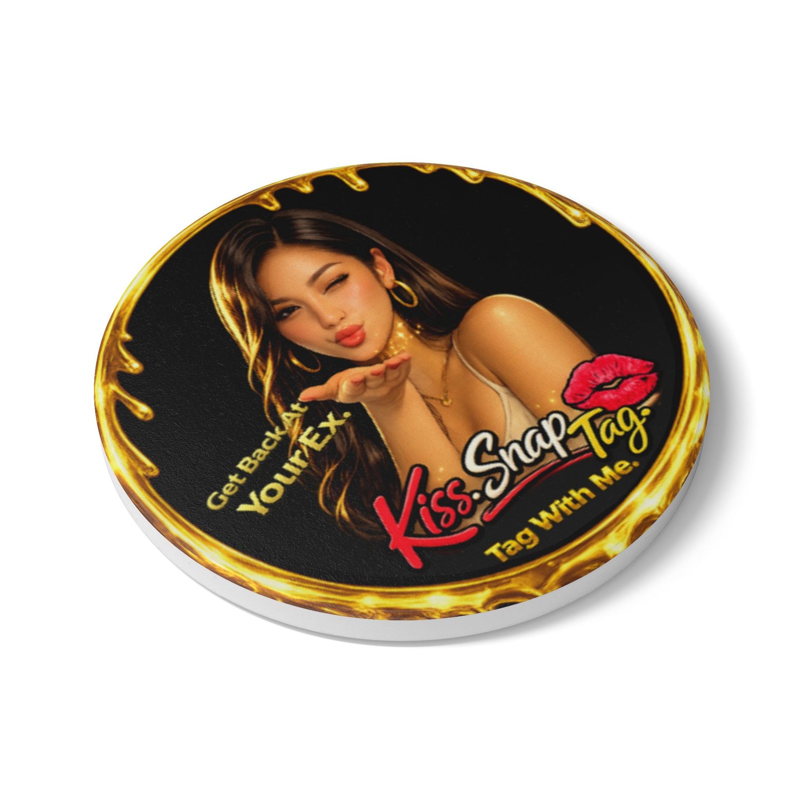 The Get Back At Your Ex Kiss Snap Tag ceramic coaster adds playful nightlife energy directly to the table.