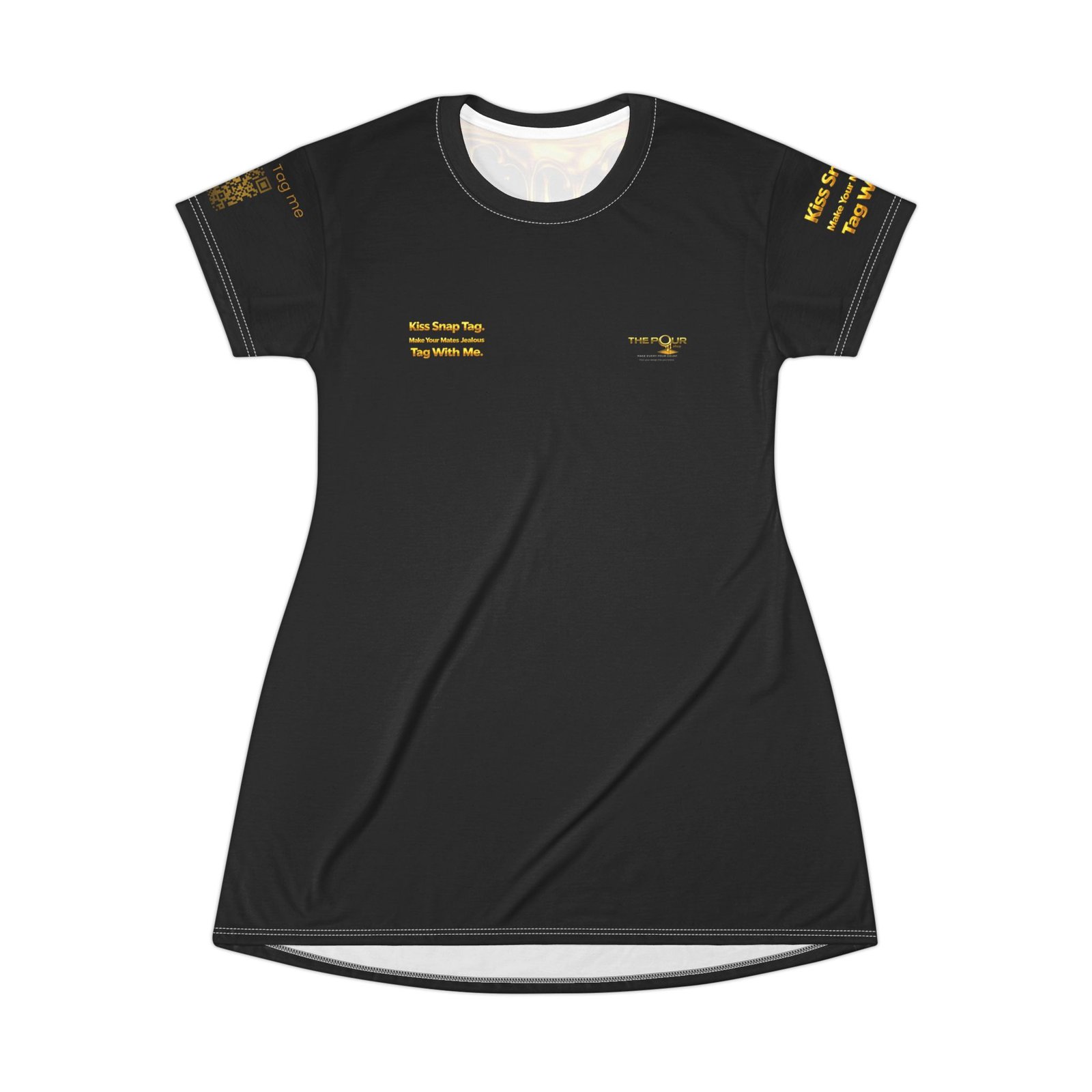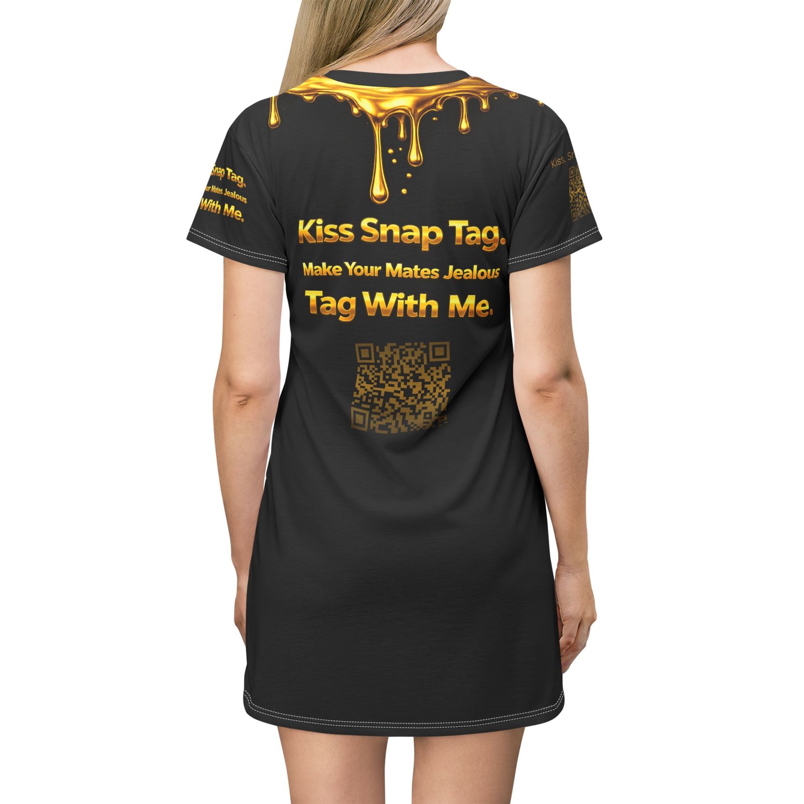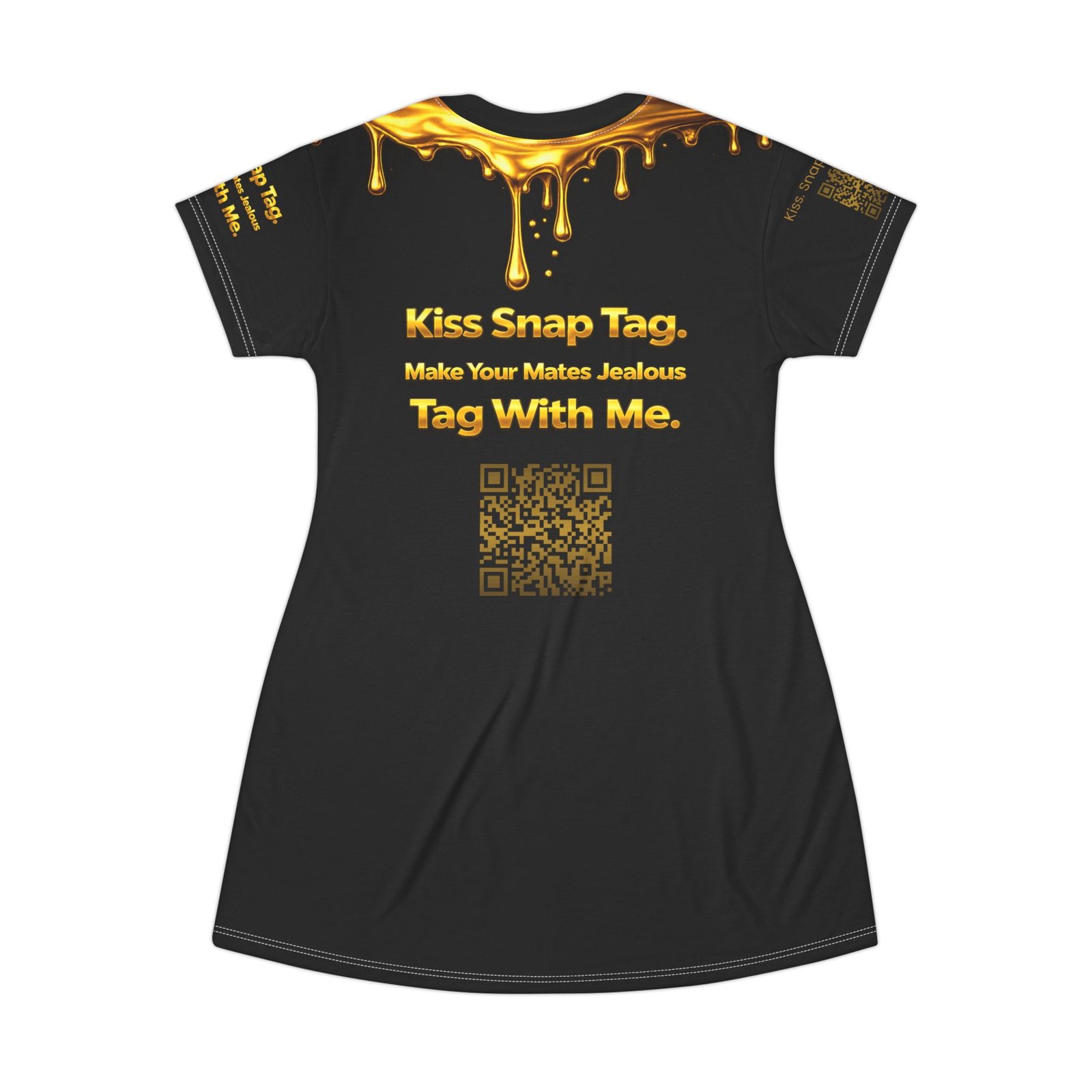 The glossy gold drip design across the shoulders creates instant visual impact, while the bold message “Kiss Snap Tag. Make Your Mates Jealous. Tag With Me.” invites curiosity and interaction. The integrated QR code transforms the dress from simple apparel into a scannable social moment.