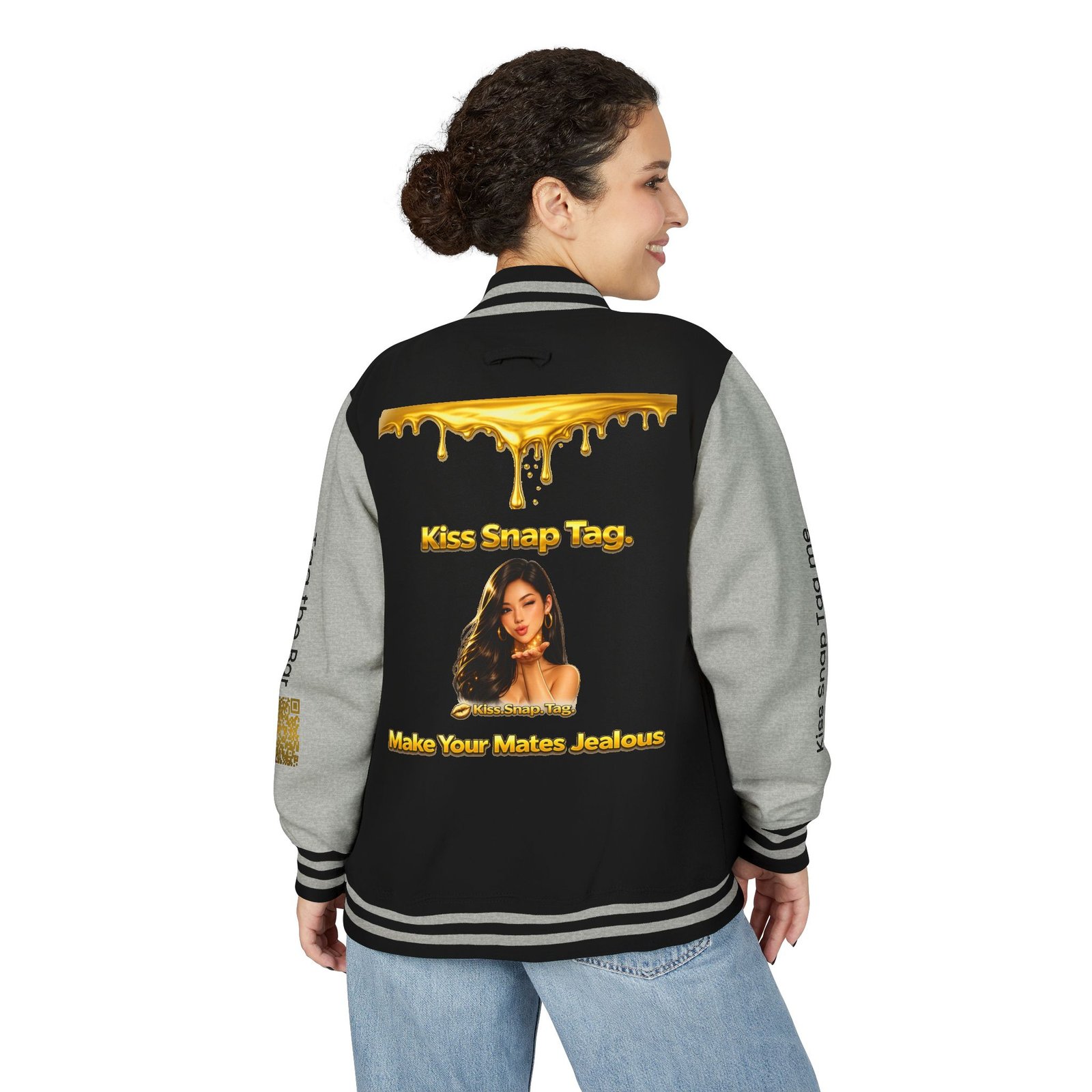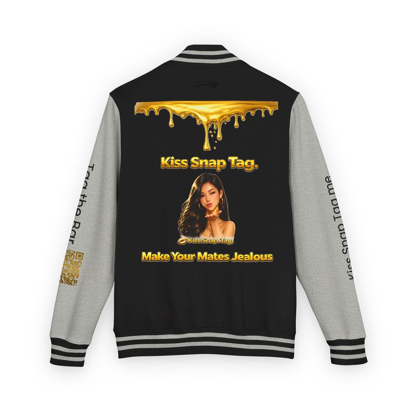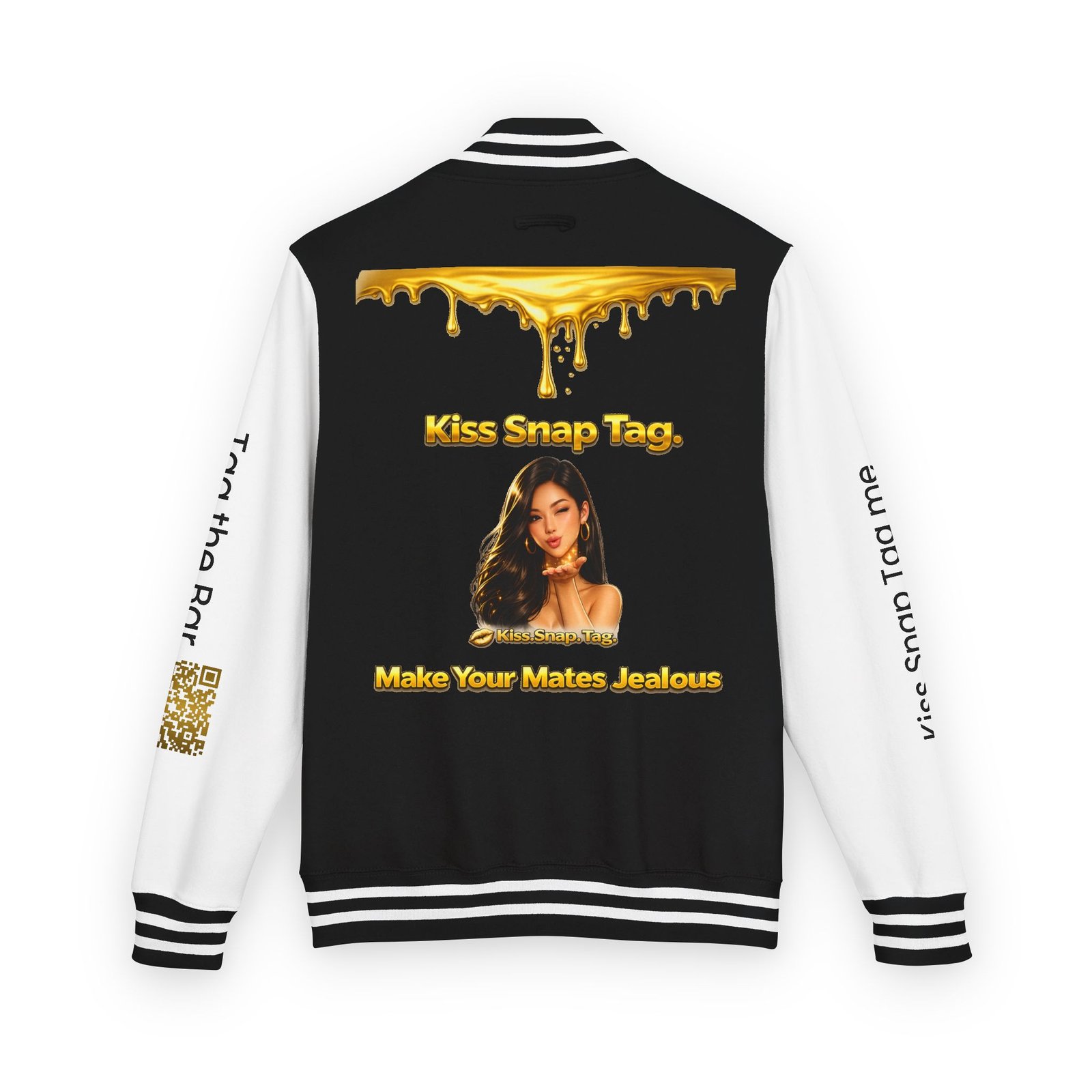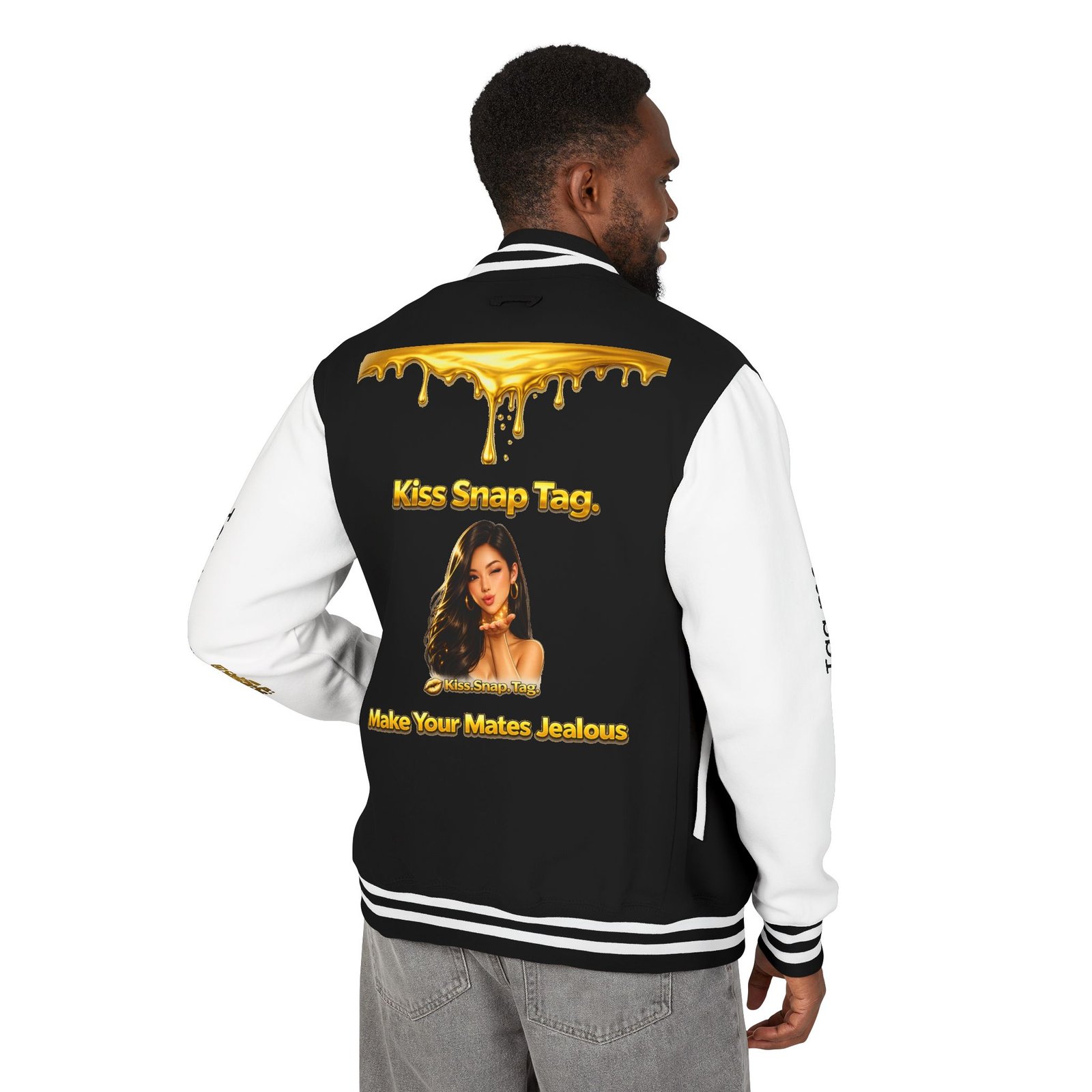 The dripping gold artwork, confident “Kiss Snap Tag.” message, and interactive QR detail transform the jacket from simple outerwear into a social trigger. The design invites curiosity, conversation, and interaction while maintaining the strong visual identity of classic varsity streetwear.