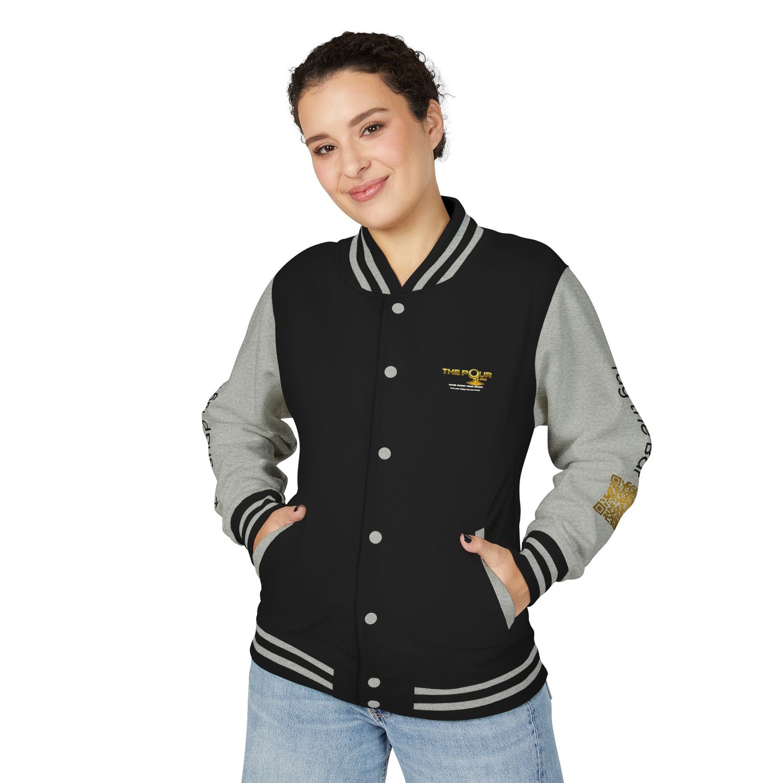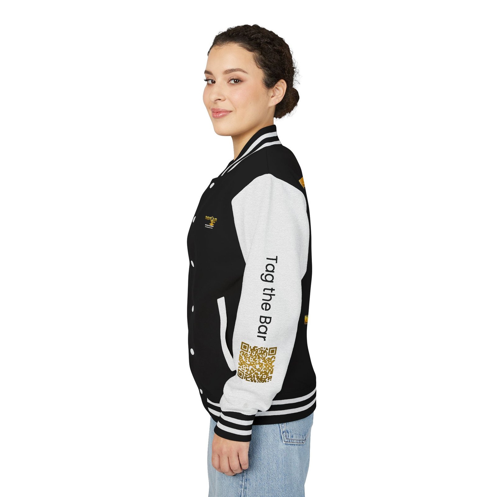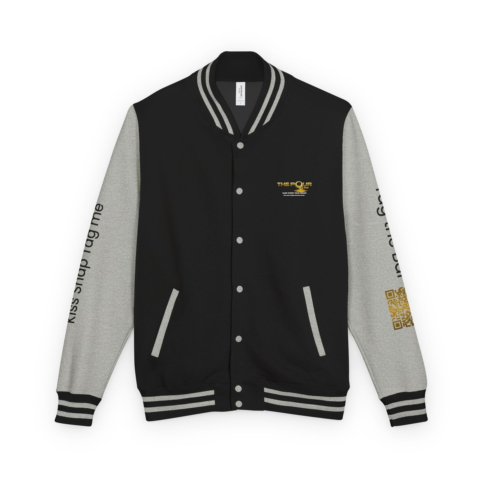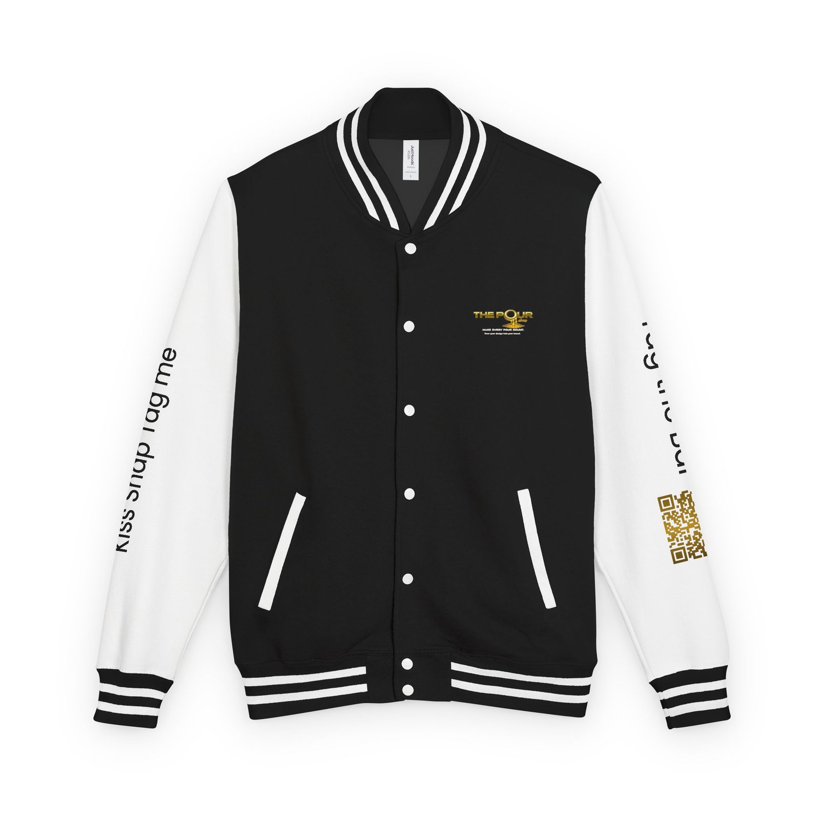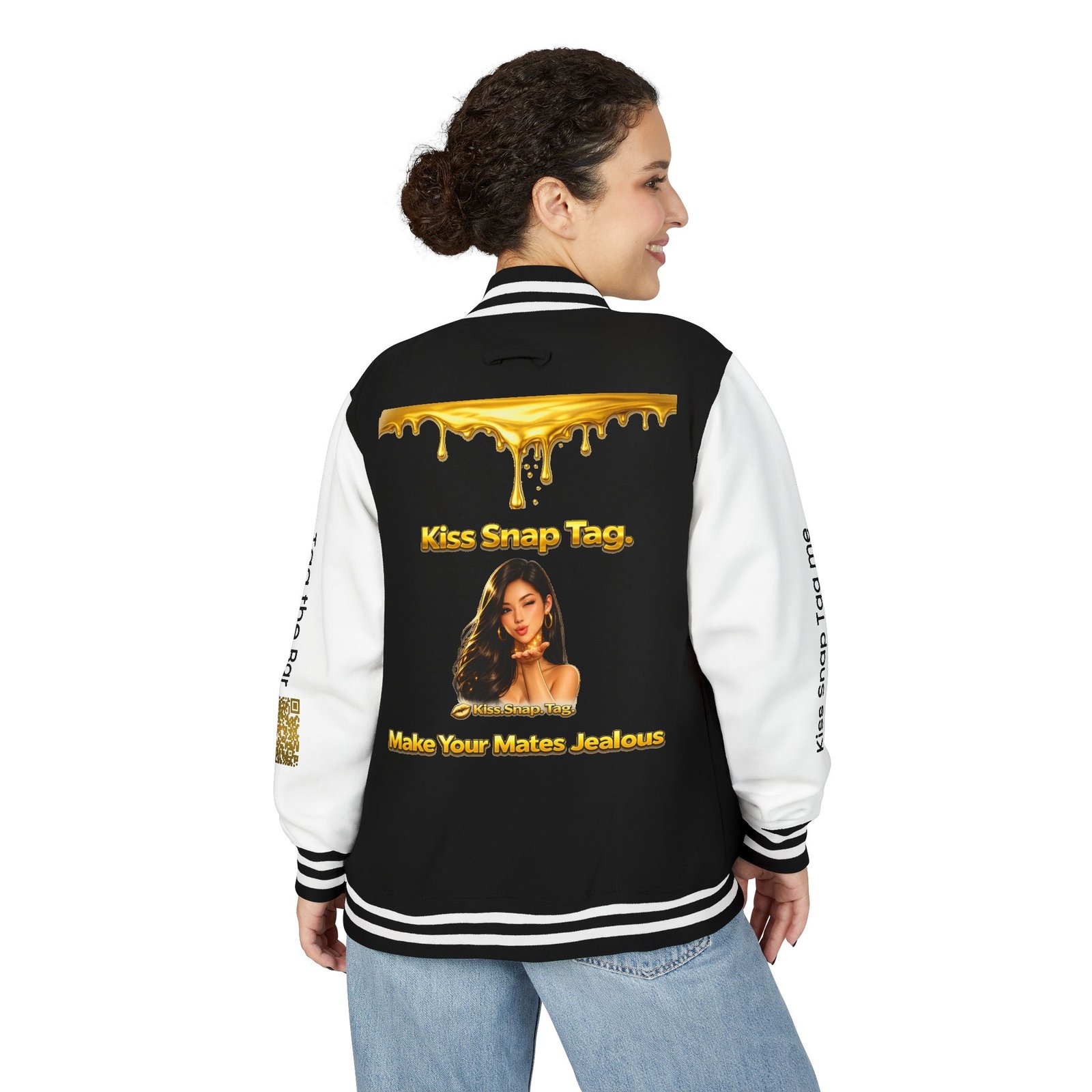 The dripping gold artwork, confident “Kiss Snap Tag.” message, and interactive QR detail transform the jacket from simple outerwear into a social trigger. The design invites curiosity, conversation, and interaction while maintaining the strong visual identity of classic varsity streetwear.