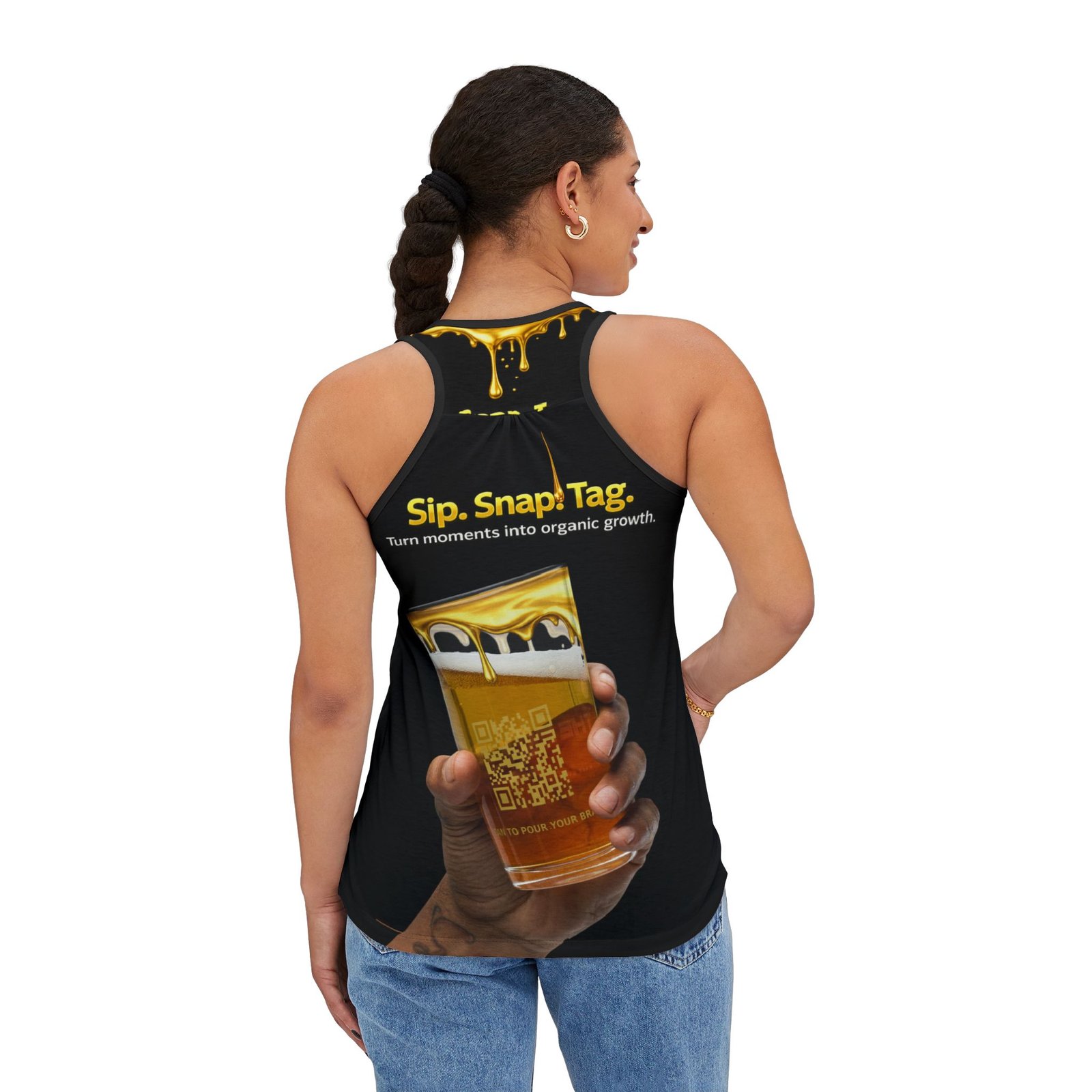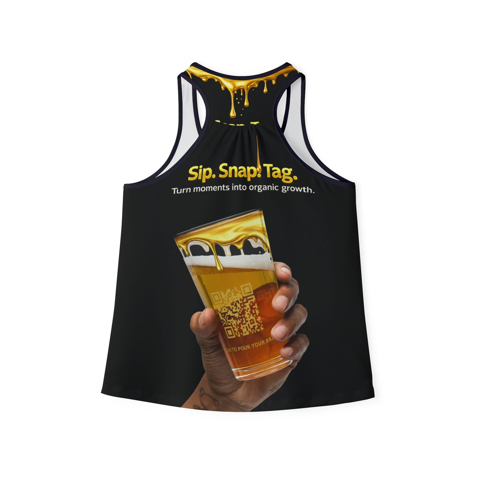 The bold gold drip graphic frames the message “Sip. Snap. Tag.” while the printed QR code invites real-world interaction. One scan turns a simple garment into a shareable moment, linking people to your brand, venue, or social channels.