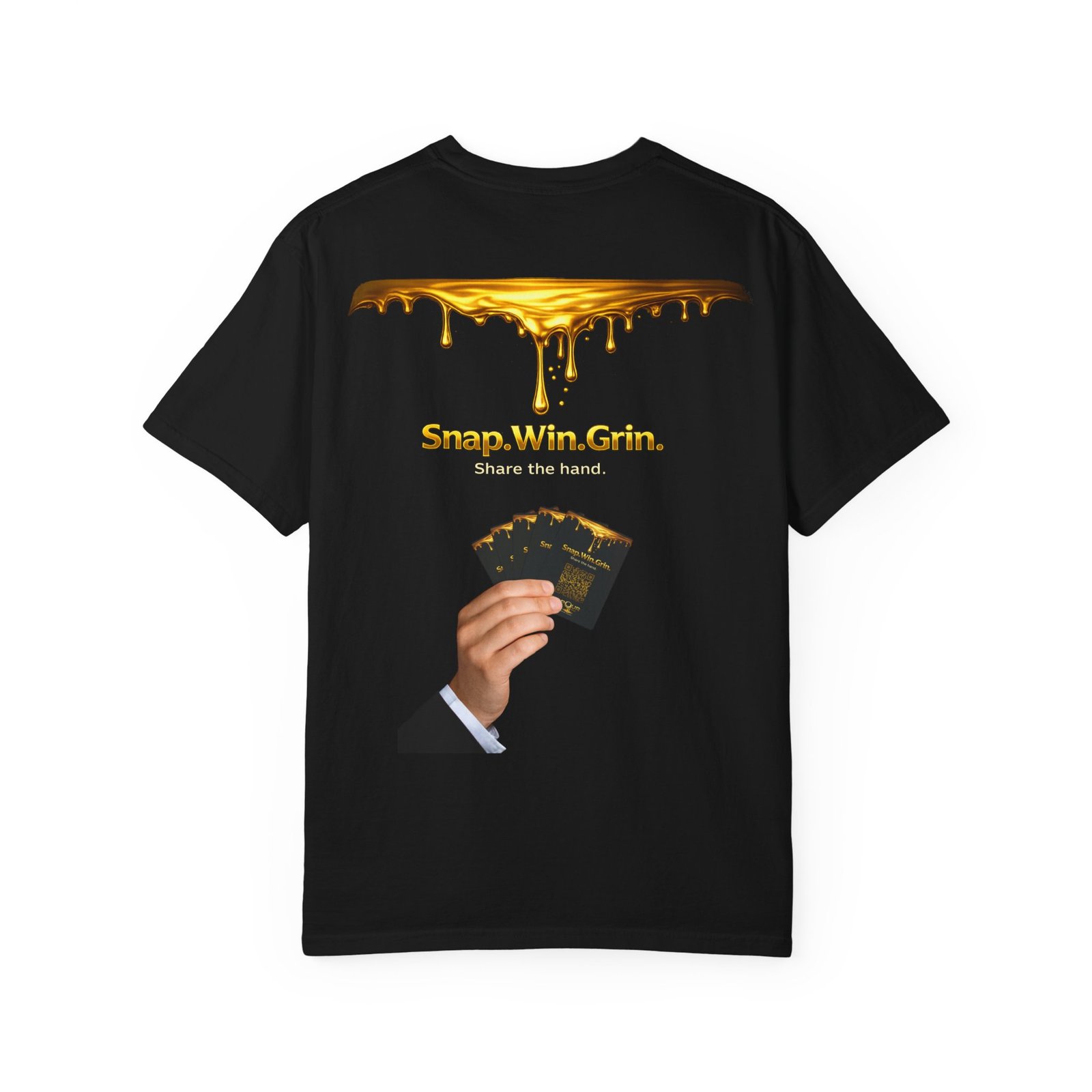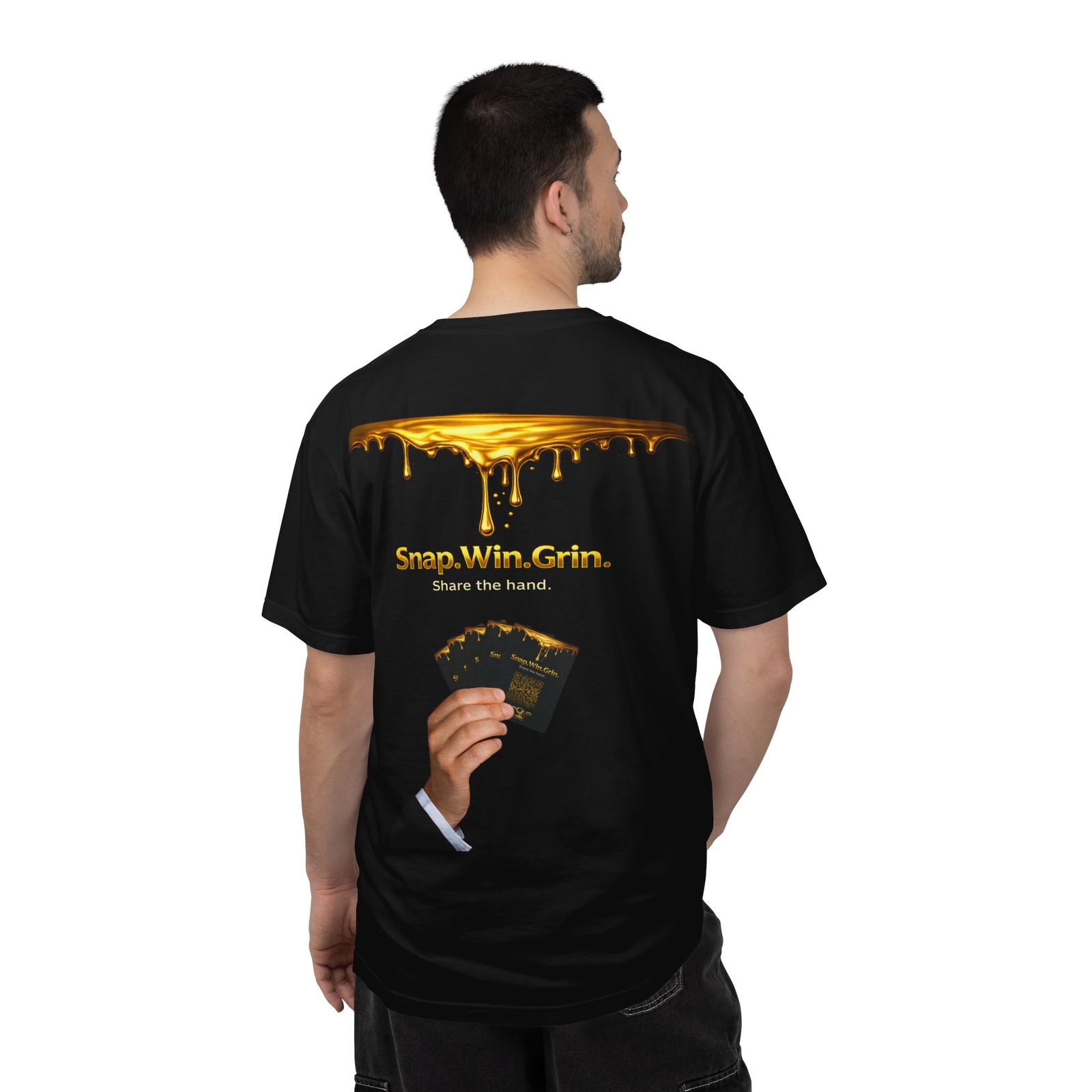 The black garment-dyed fabric delivers a vintage feel from the first wear, while the gold drip artwork across the back frames a winning hand of cards and the confident message: Snap. Win. Grin. Share the hand.