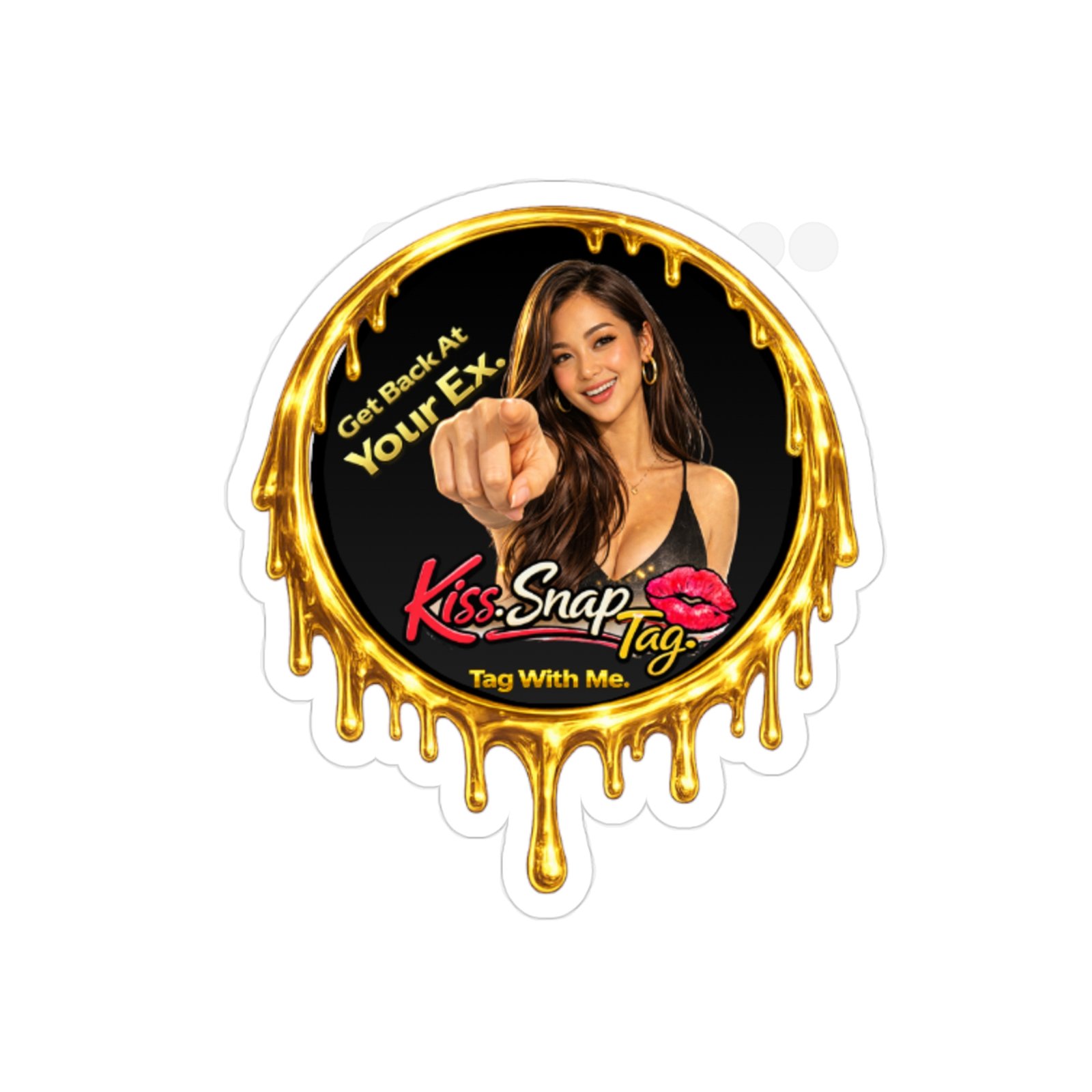 Framed with the signature liquid gold drip border and deep black background, this die-cut transparent sticker features the playful pointing pose that instantly engages viewers. The bold You Need To Do It message and Kiss Snap Tag branding create a direct visual call-out that encourages photos, tagging, and shareable moments.