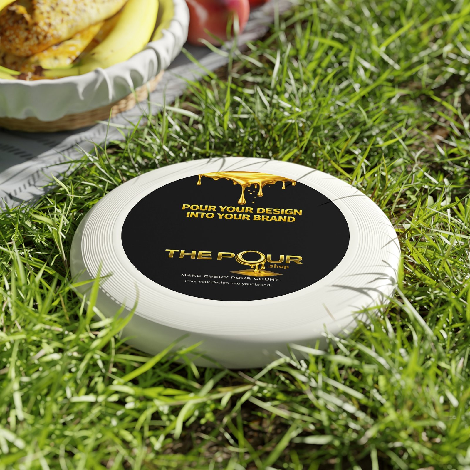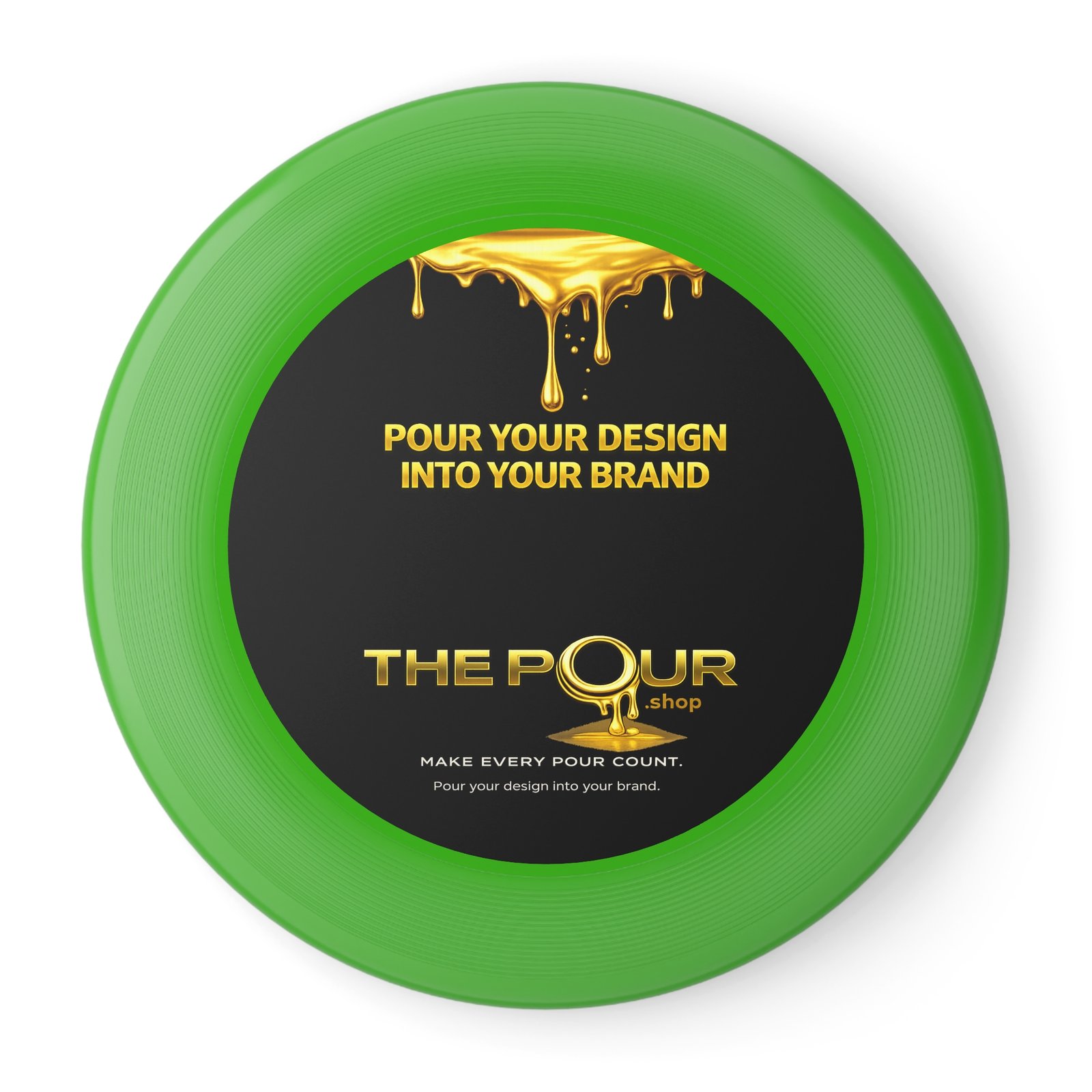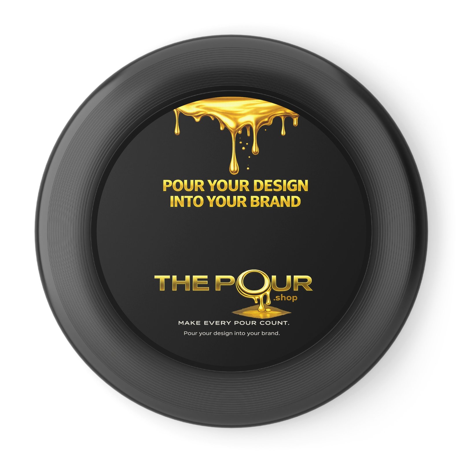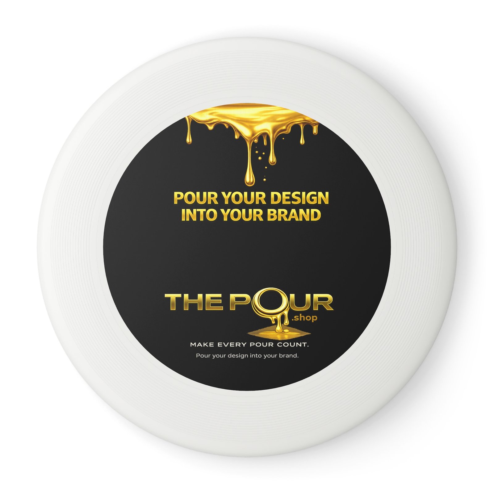 The top of the disc features the THE POUR logo and brand message, creating a clean, modern appearance while turning a simple outdoor game into a branded moment.