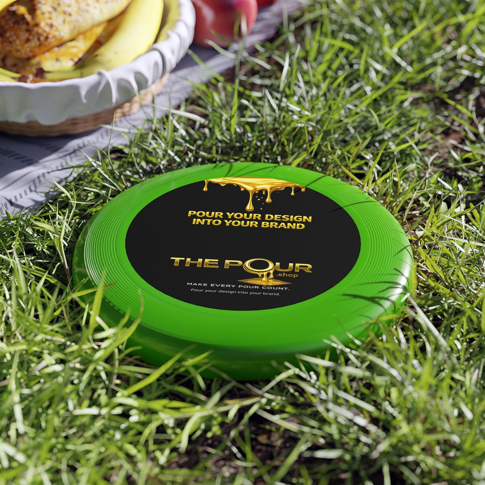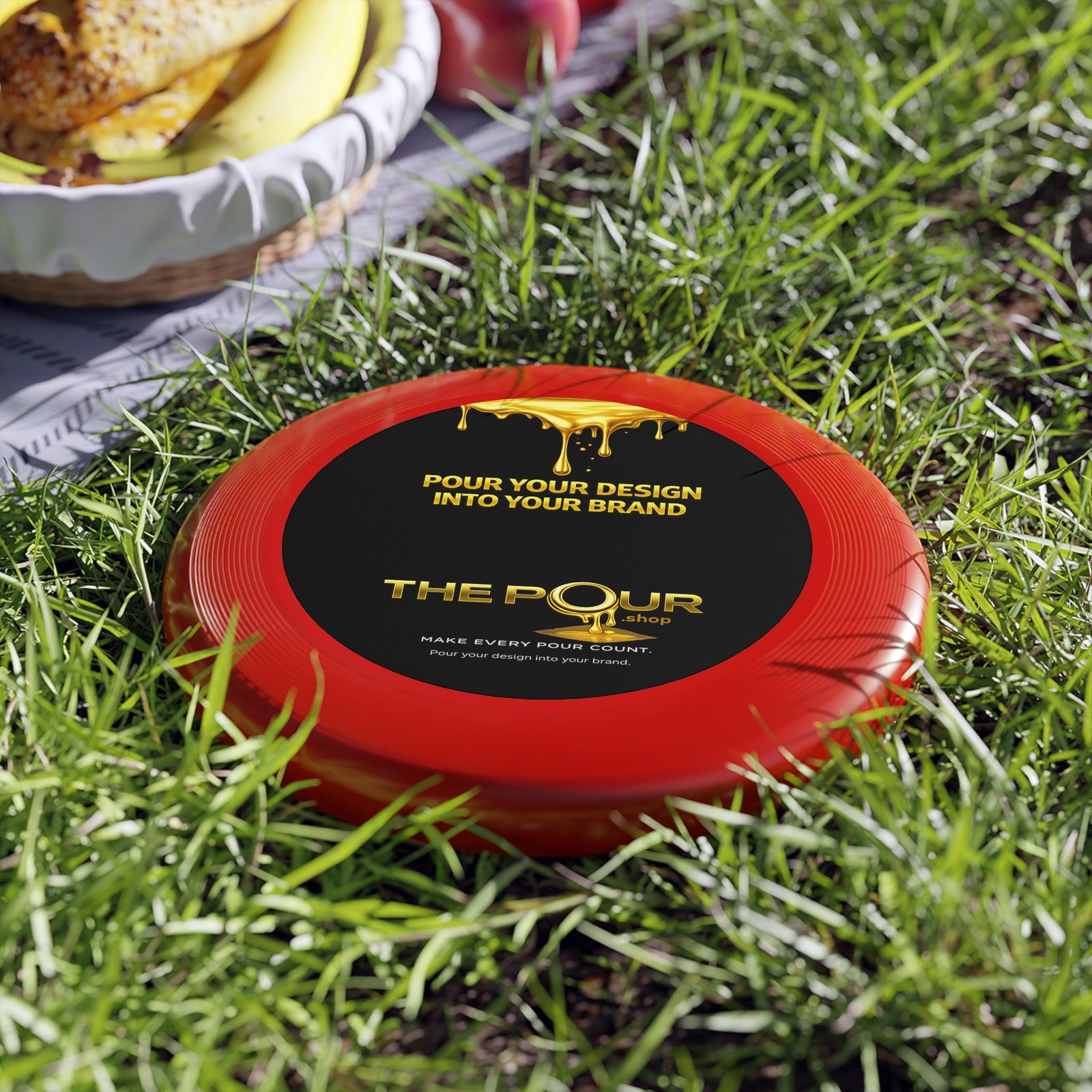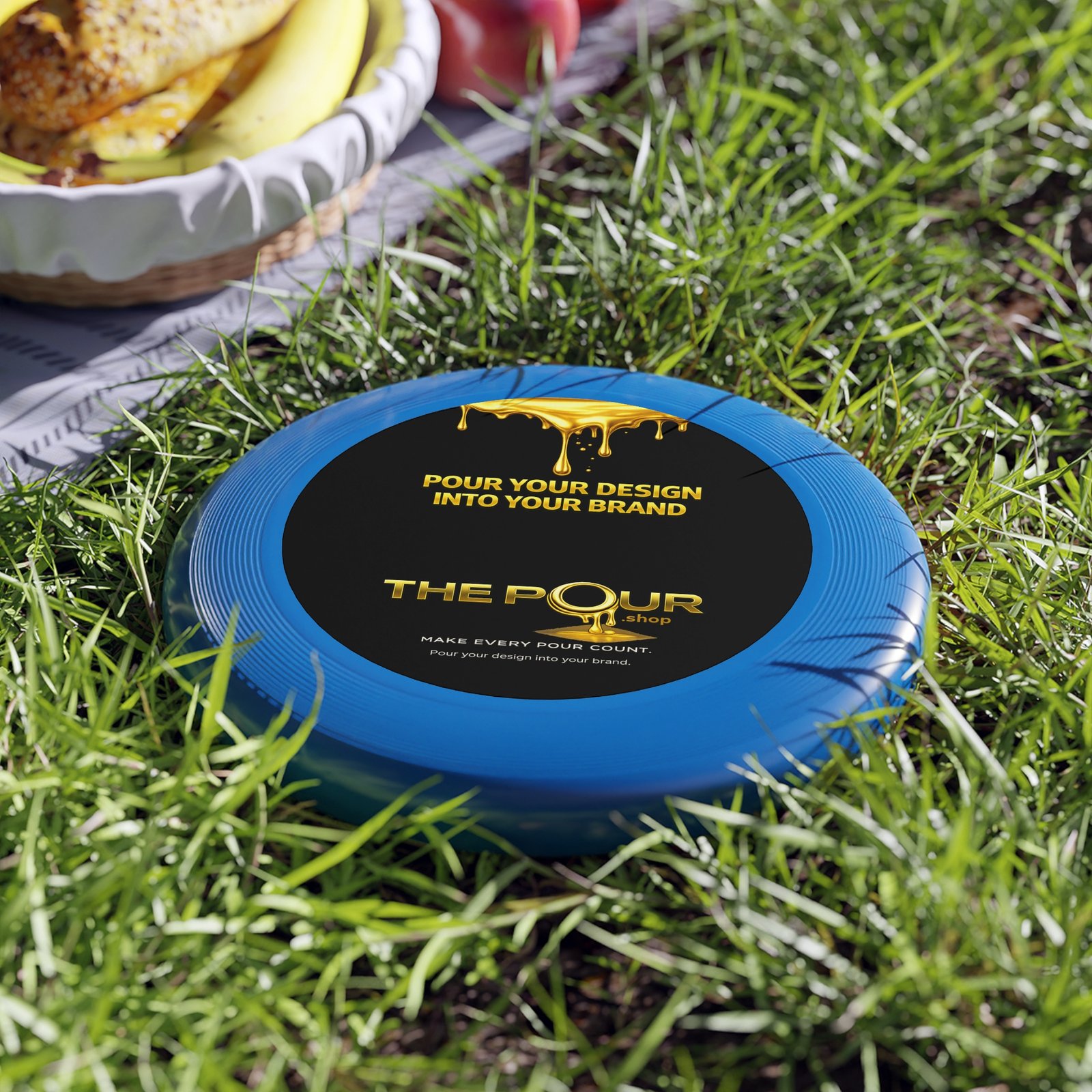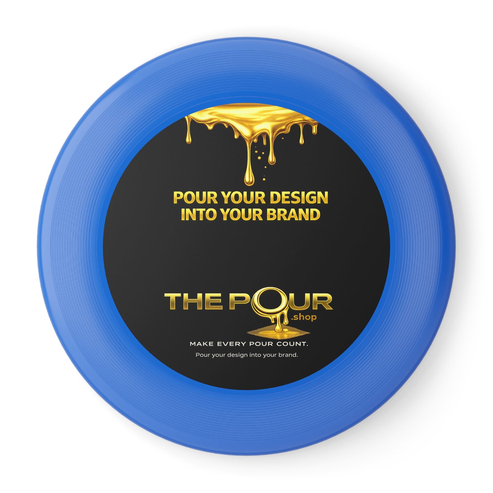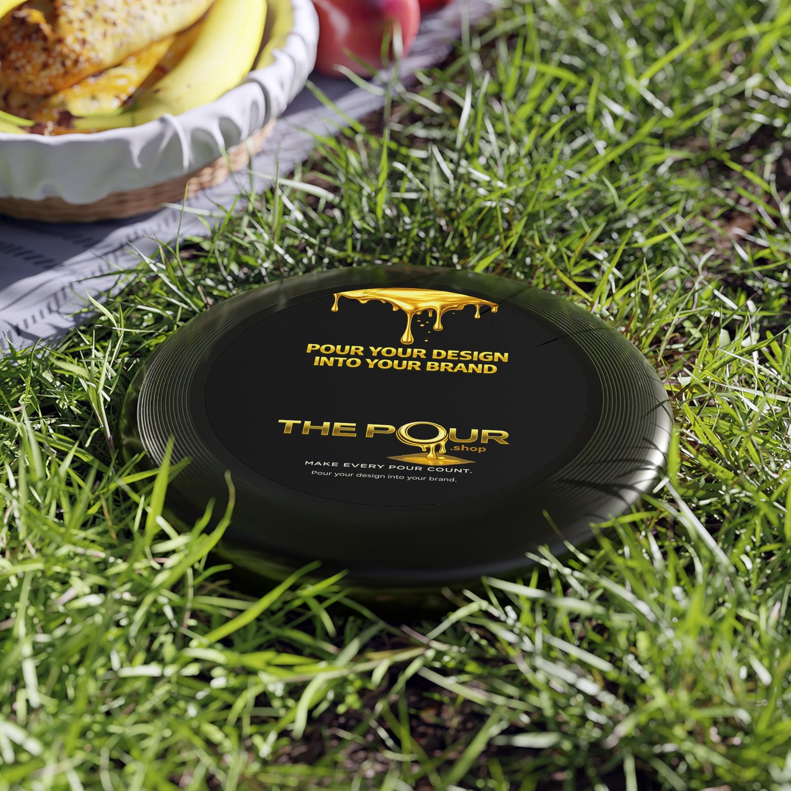 The top of the disc features the THE POUR logo and brand message, creating a clean, modern appearance while turning a simple outdoor game into a branded moment.