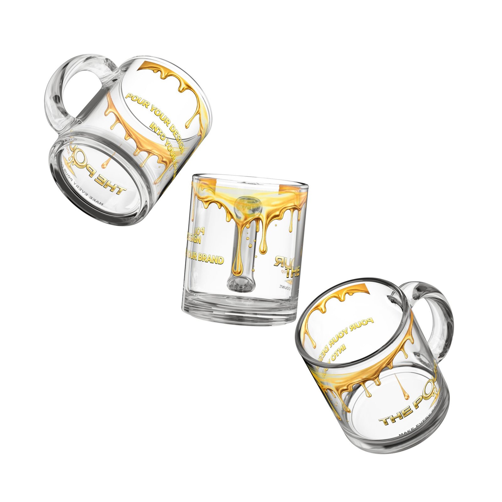 The clear glass body highlights the drink inside while the signature gold drip Pour design flows around the rim, creating a striking contrast between the transparent mug and the molten gold artwork.
